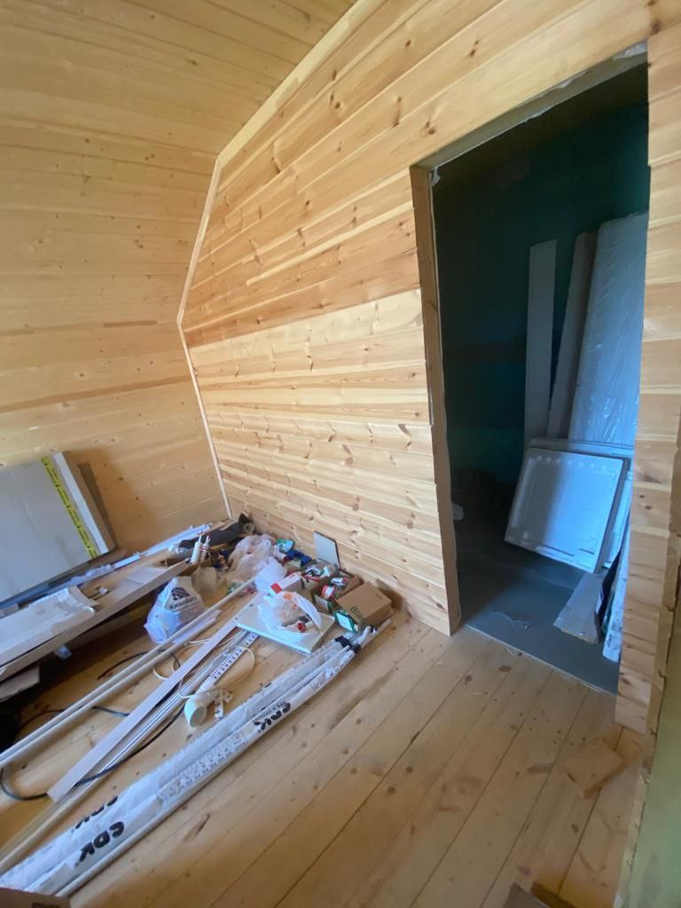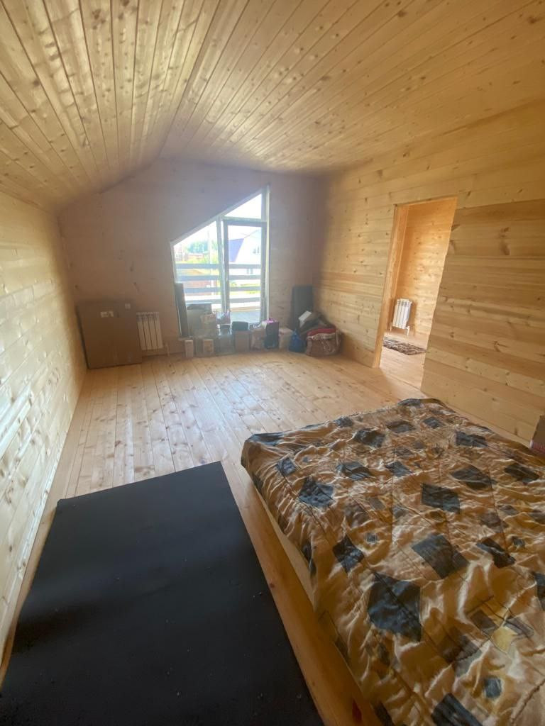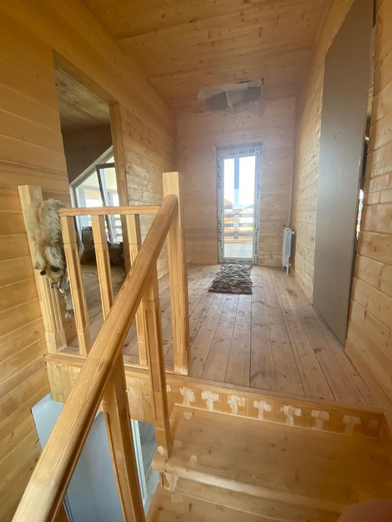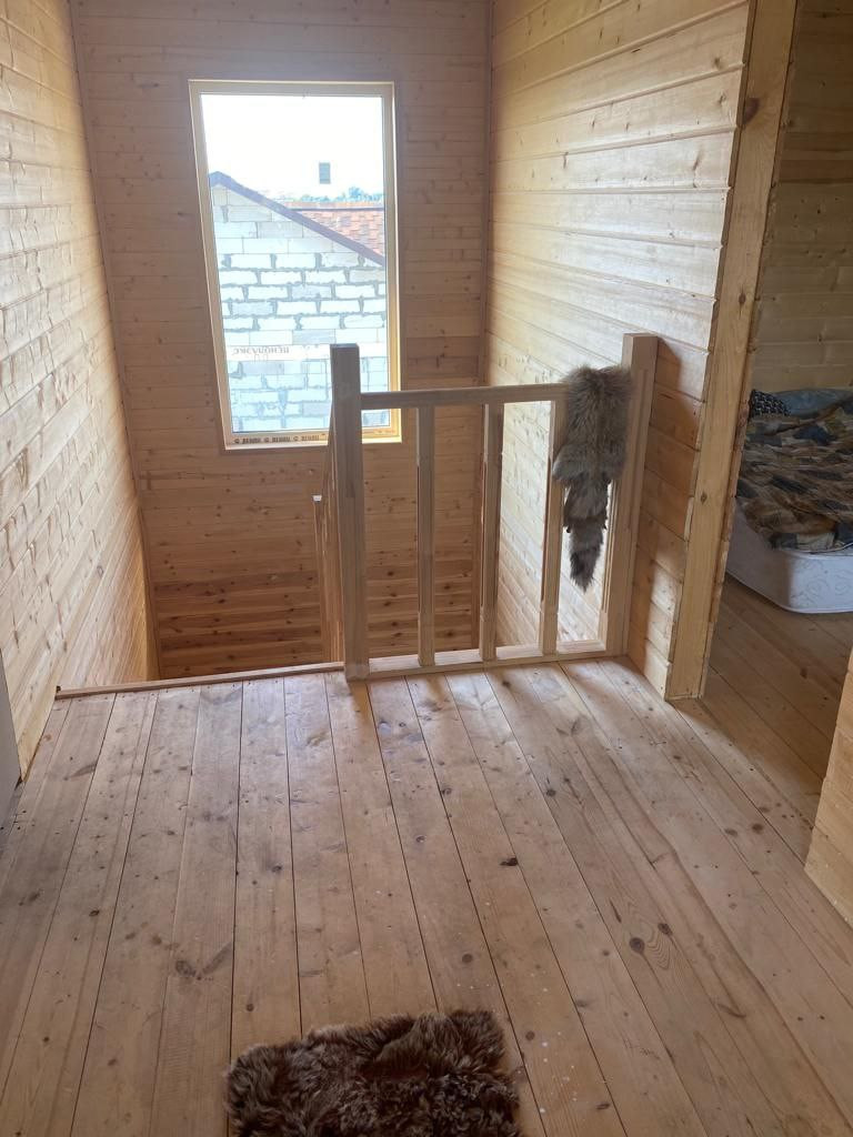 Деревянная комфортная лестница ведет на второй этаж. Это может быть личная зона собственников . Второй этаж обит вагонкой. Здесь две спальни , одна из которых планировалась с санузлом ( но можно использовать и как гардеробную), и выход на шикарную просторную веранду с прекрасным видом!