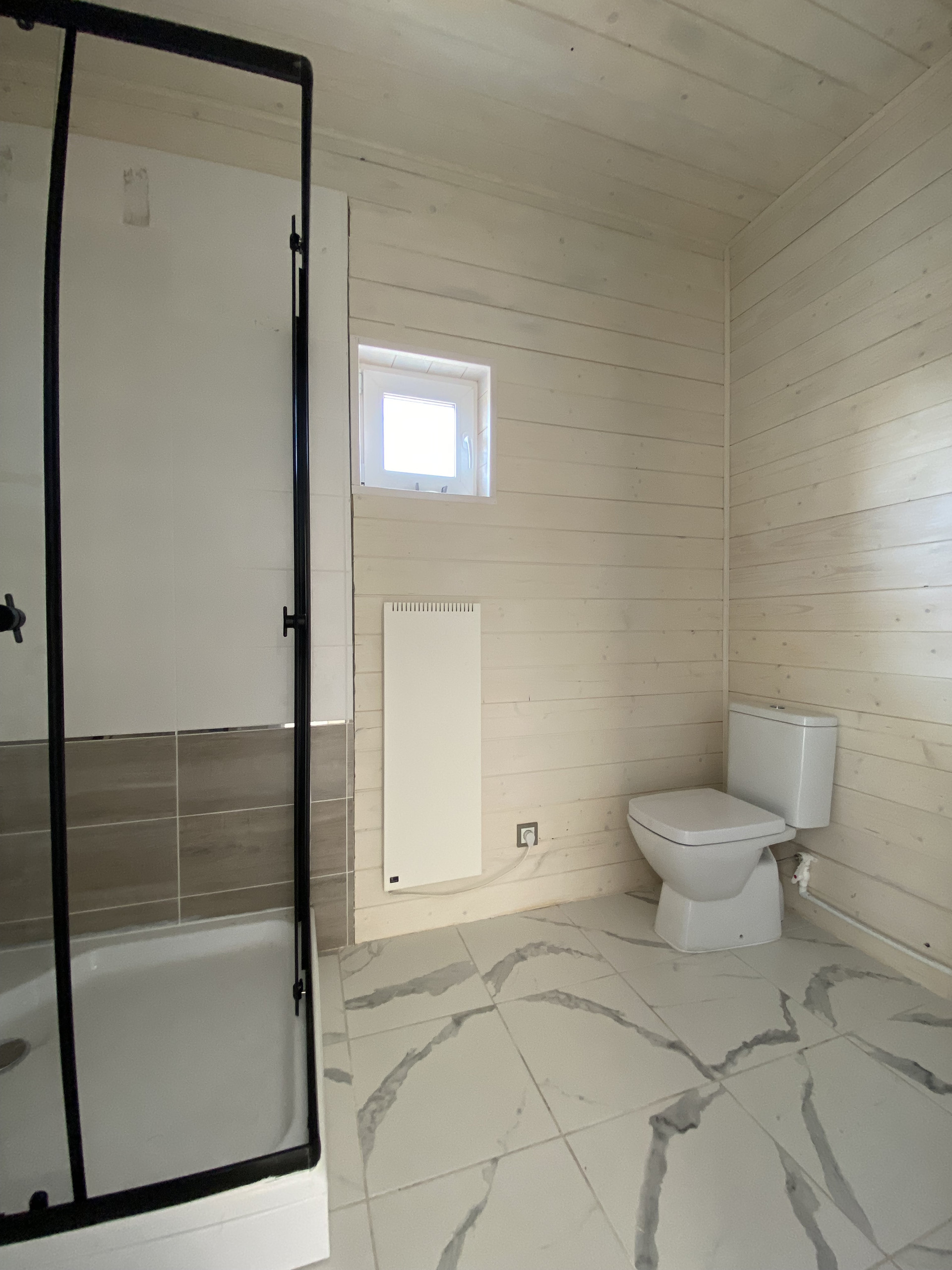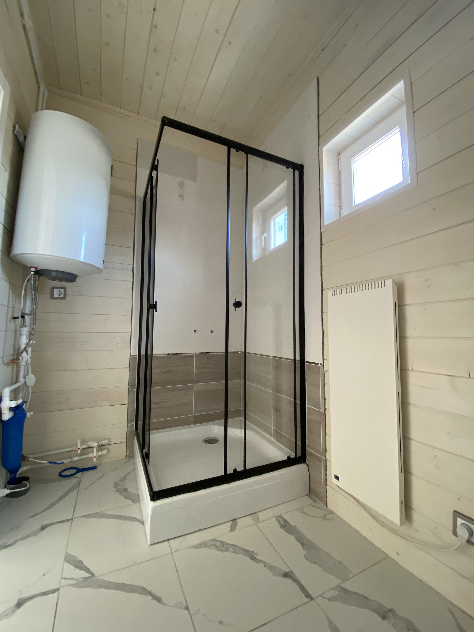 — В сан.узле теплый пол, установлены душевая кабина, водонагреватель и унитаз.