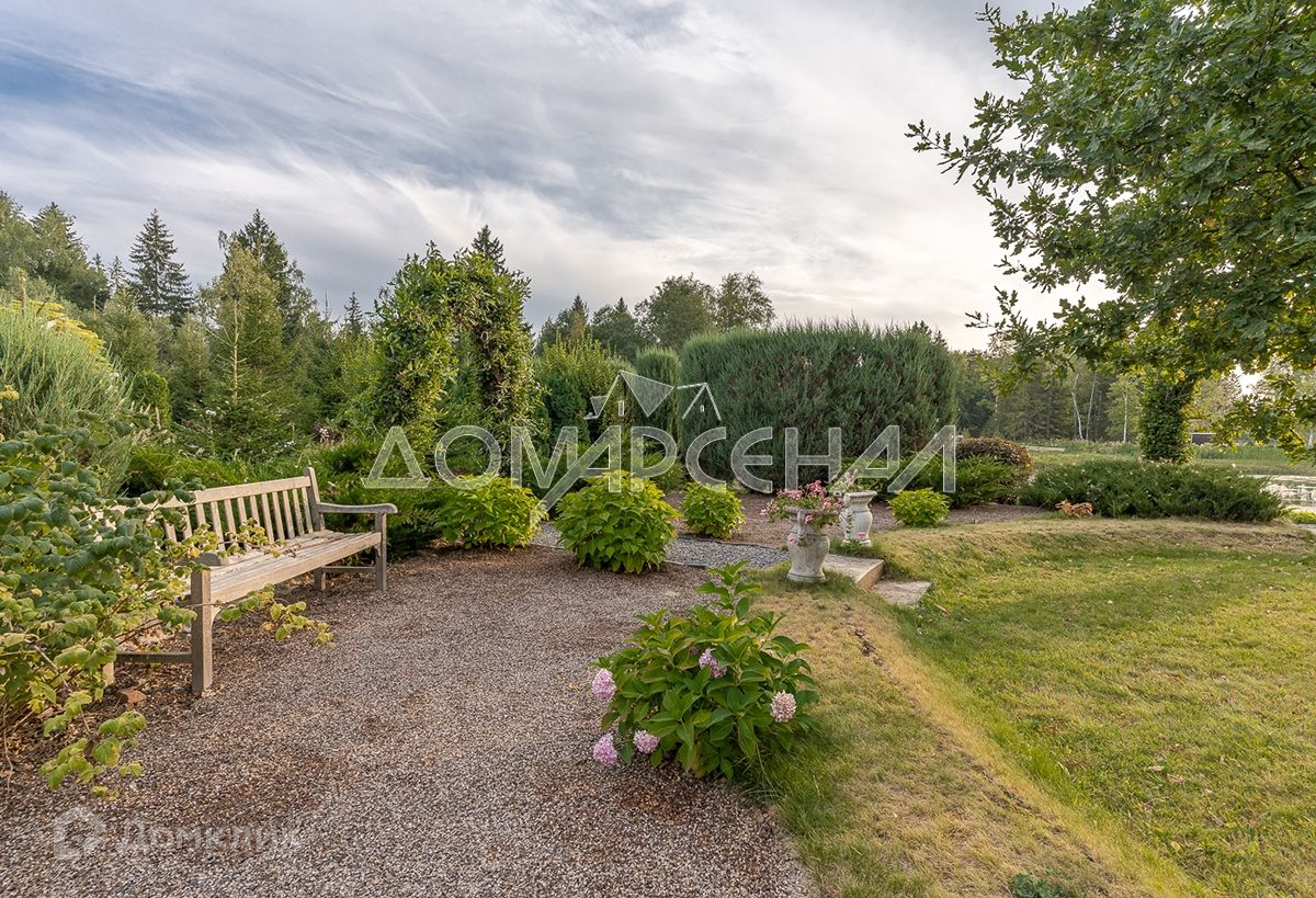 На участке выполнен уникальный ландшафтный дизайн в регулярно пейзажном стиле, собственная береговая линия из каменных валунов и дорожек.