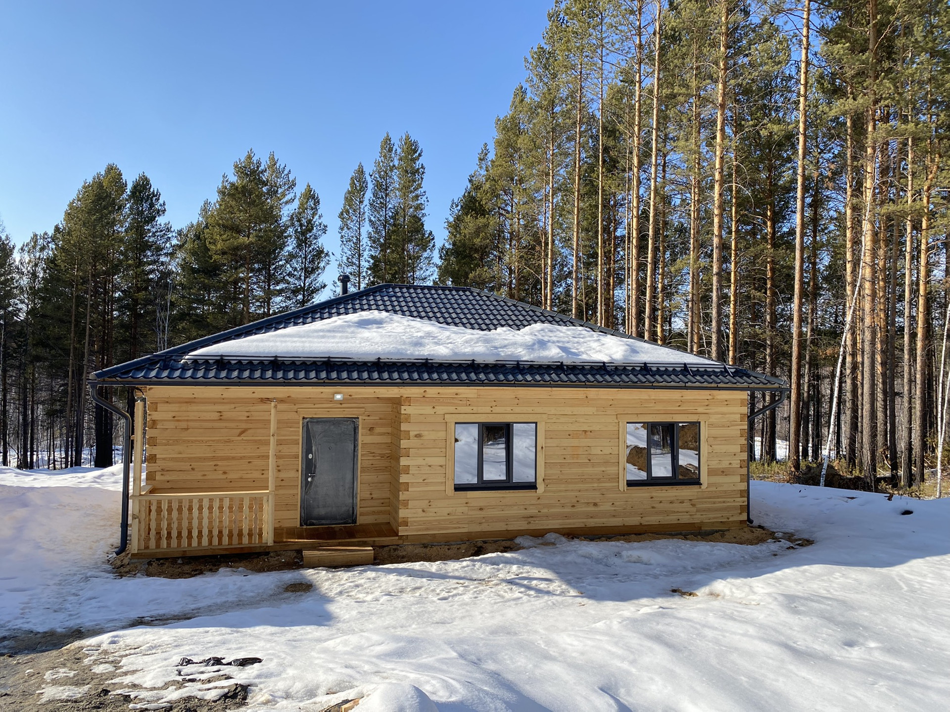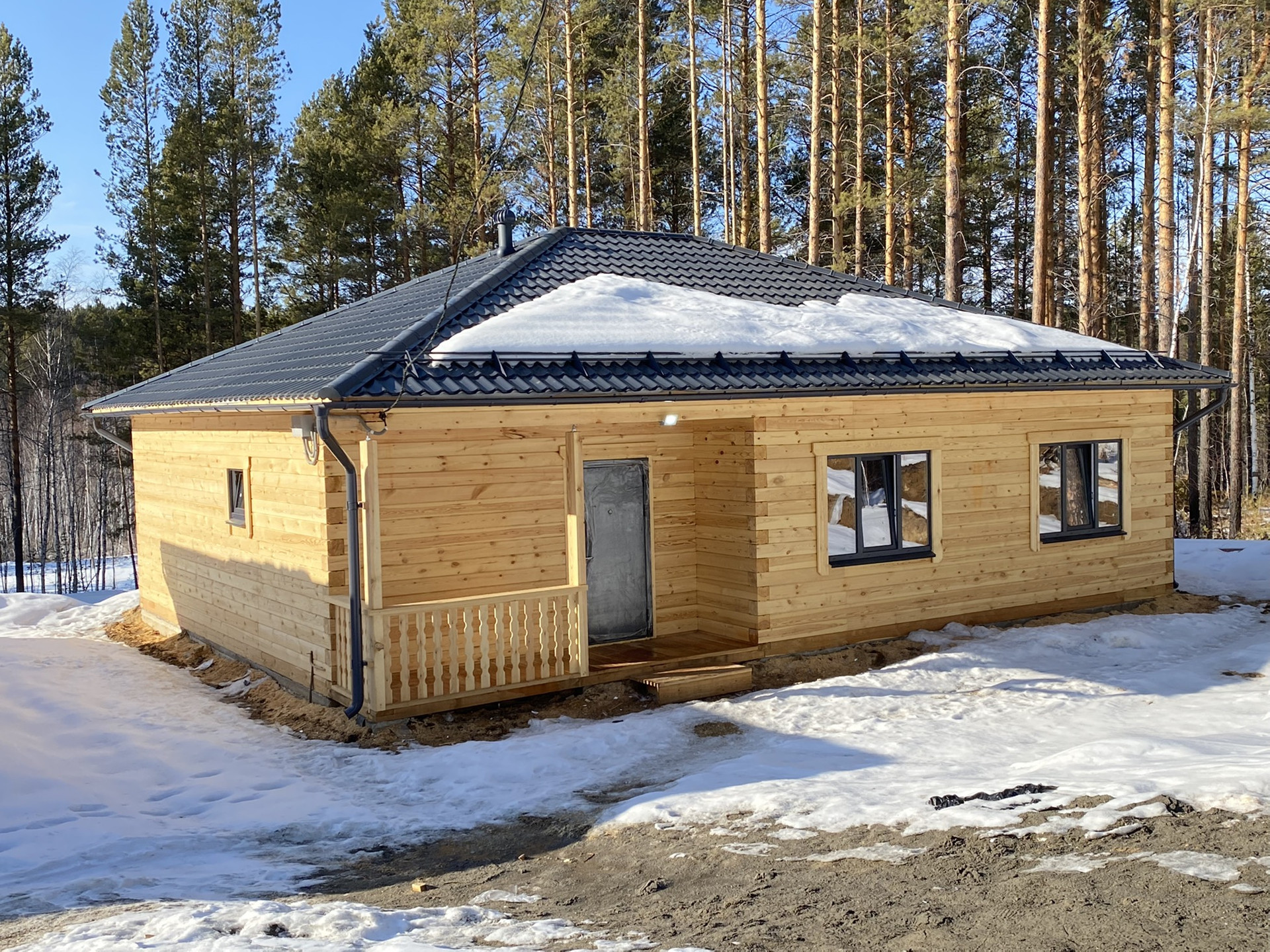 - Дом построен из 18 профилированного бруса, обеспечивая надежную структуру.