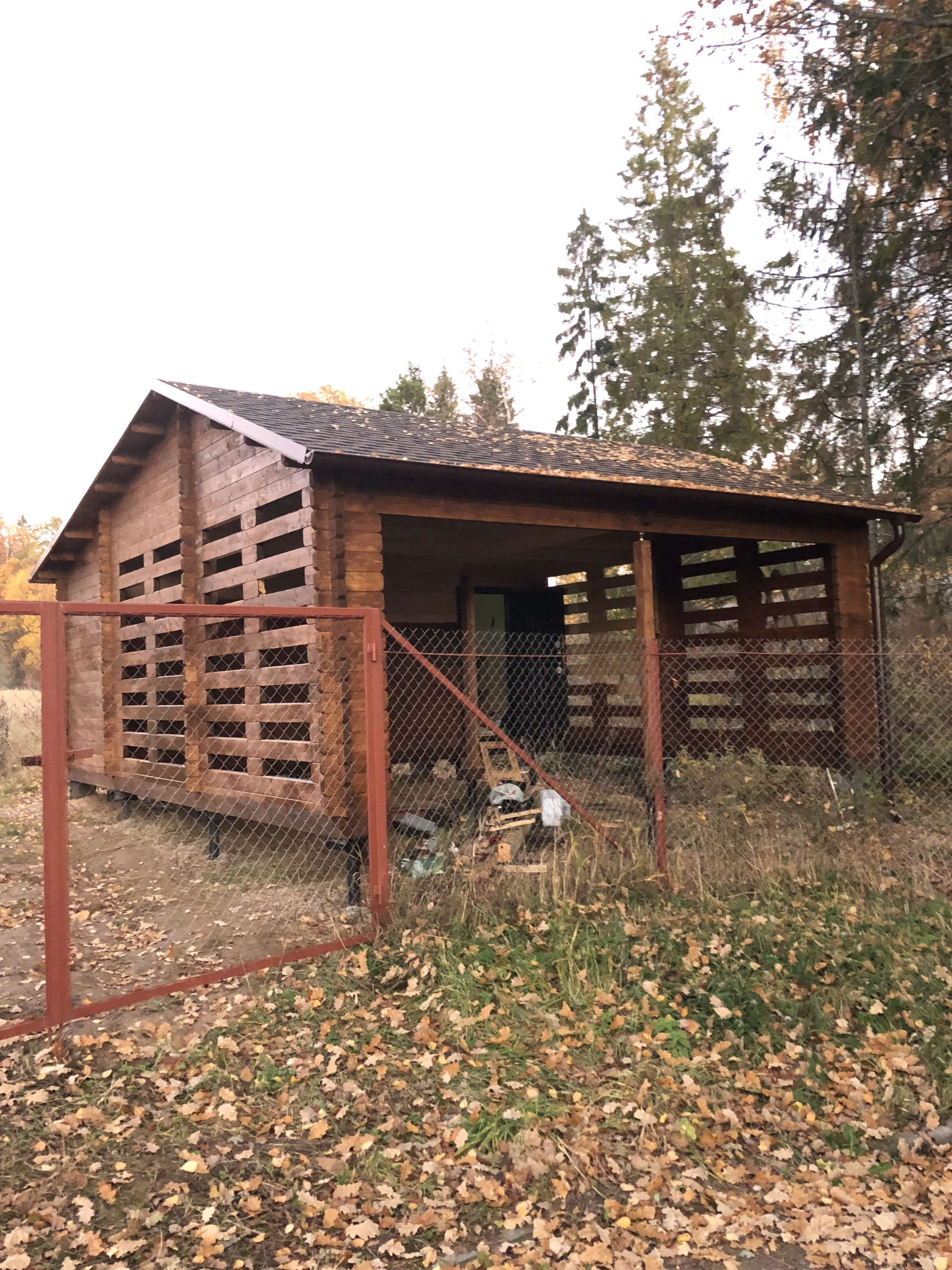 На участке установлен навес для двух машин совмещенный с хозблоком из клееного бруса (135х60 мм) компании ТопсХаус .