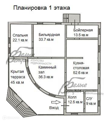 1-ый этаж: крытая терраса 45 кв.м, холл-прихожая 13 кв.м, каминный зал 36 кв.м, кухня-столовая 53 кв.м, бильярдная 34 кв.м, спальня 22 кв.м, гостевой санузел 9 кв.м, бойлерная 14 кв.м..