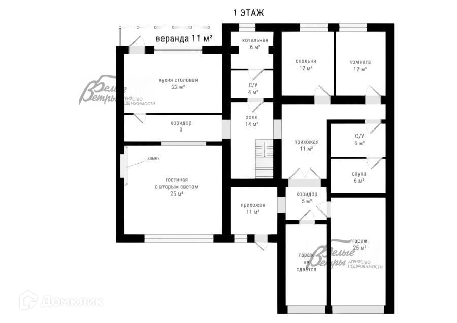 1-ый этаж: прихожая 11,4 кв.м, холл-прихожая 11 кв.м, коридор 14 кв.м, гостиная 25,5 кв.м с камином, кухня-столовая 22,7 кв.м, санузел, котельная 6 кв.м, спальня 11,6 кв.м, комната 11,6 кв.м, санузел 6,6 кв.м с душем и сауной, гараж 25 кв.м..