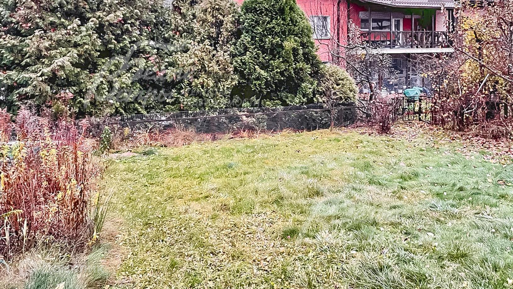 Благоустройство участка: ровный участок с газоном, перед входом в дом на участке туи и декоративные кустарники вдоль забора. Во дворе ровный участок с небольшими кустарниками и деревьями..