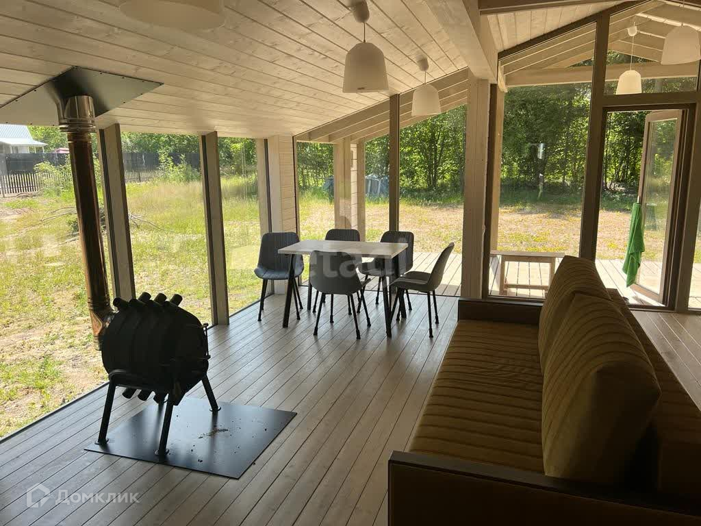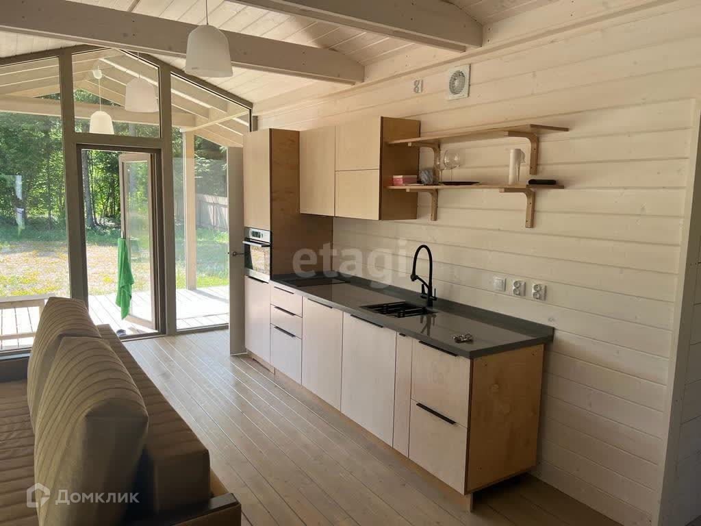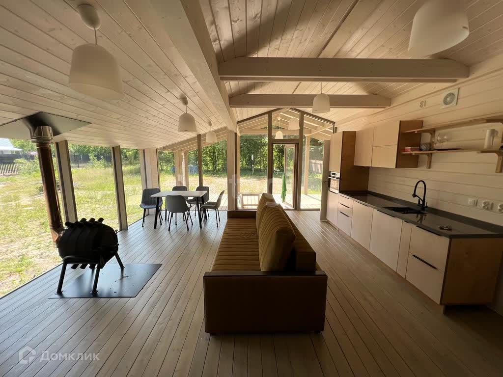 В доме просторная кухня-гостиная с панорамным остеклением, две спальные комнаты, сан узел и огромная веранда.