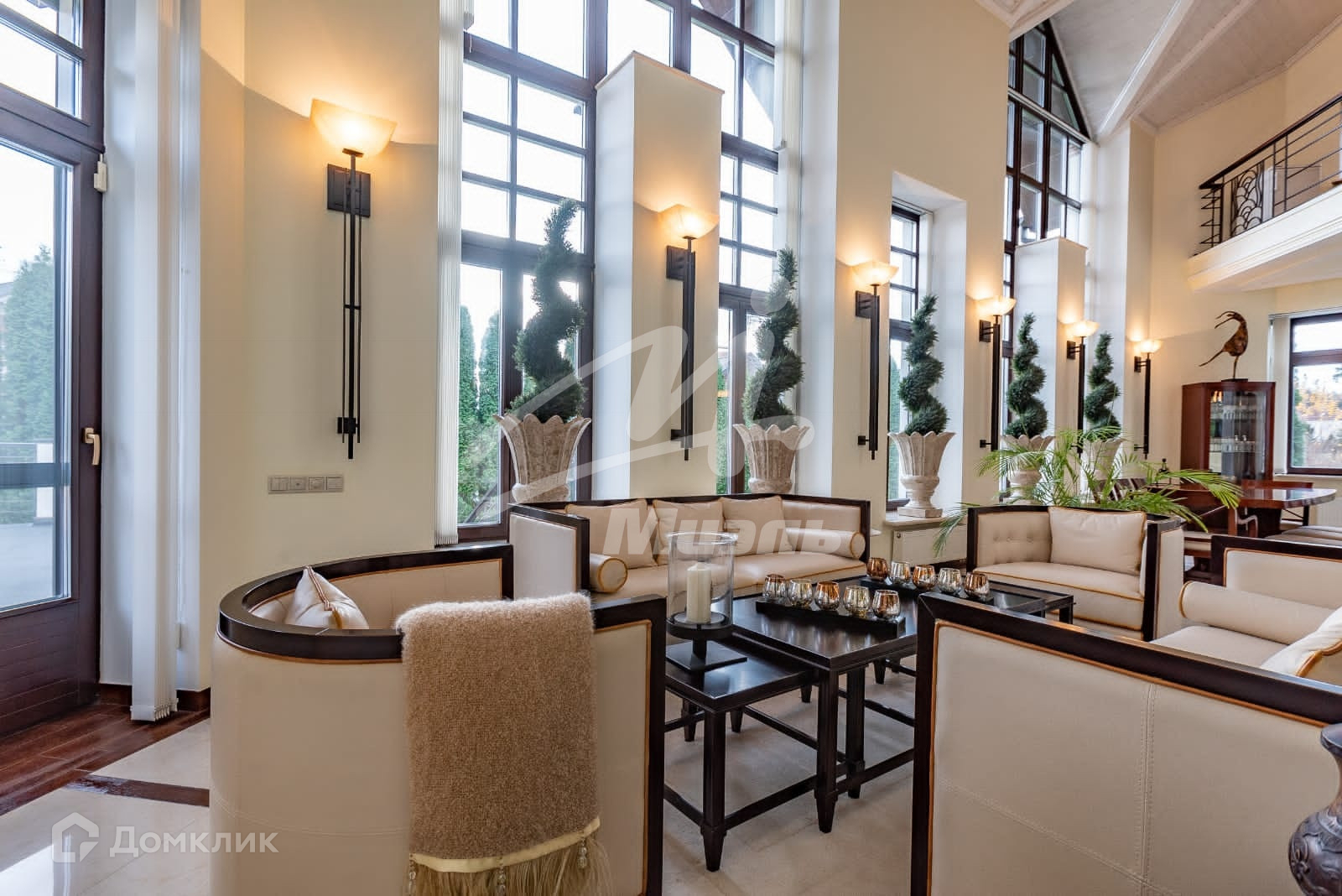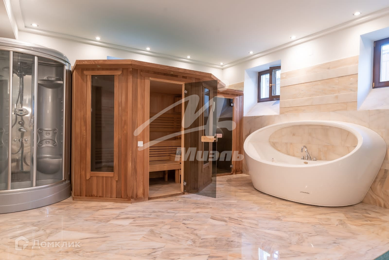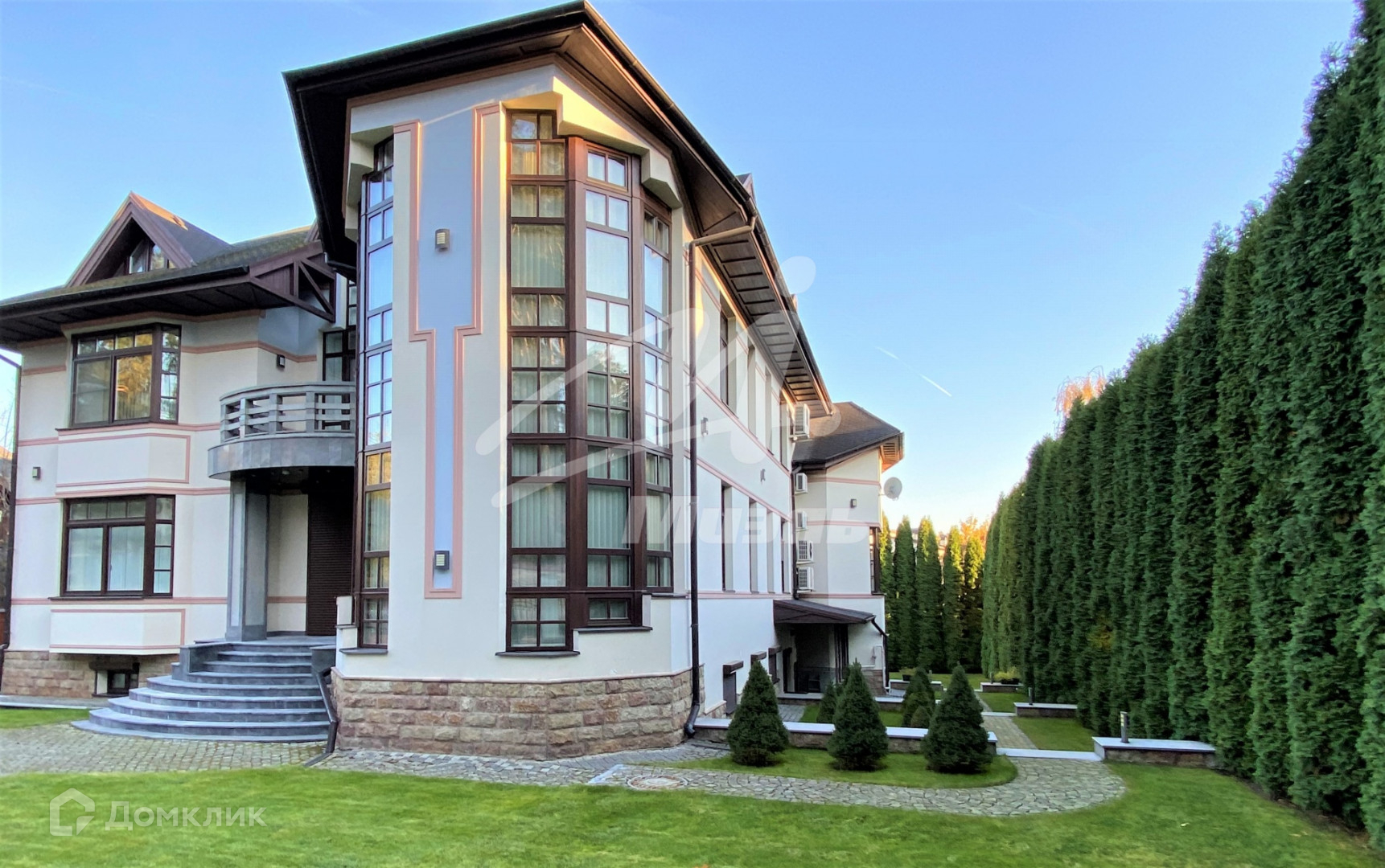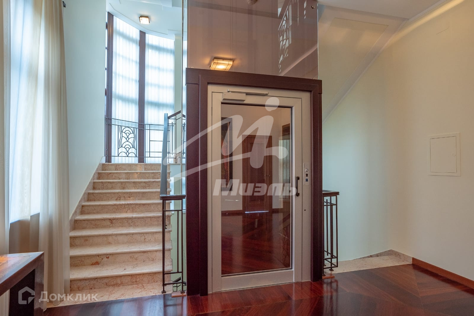 В особняке 4-х уровневый лифт, парадная лестница из розового мрамора.