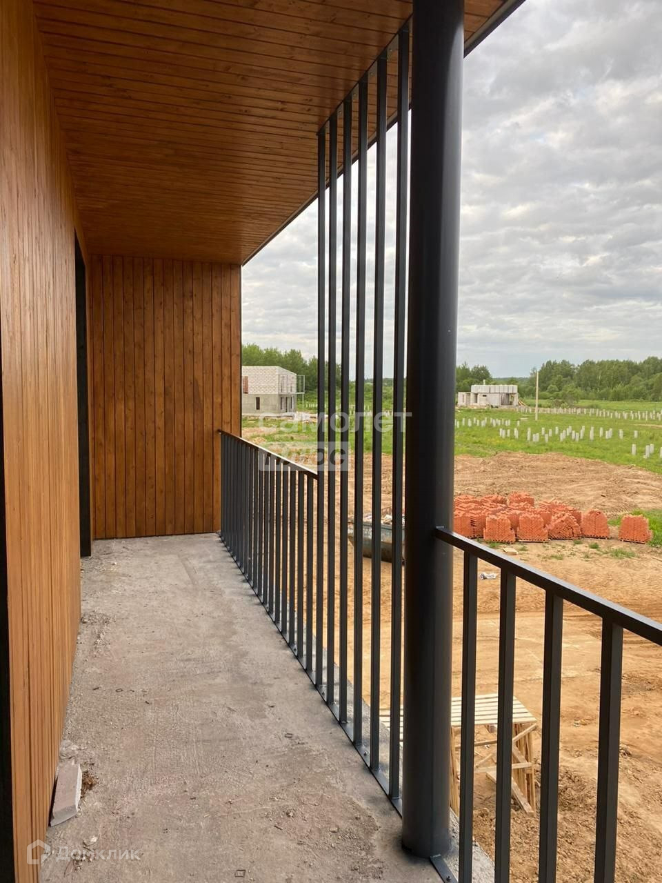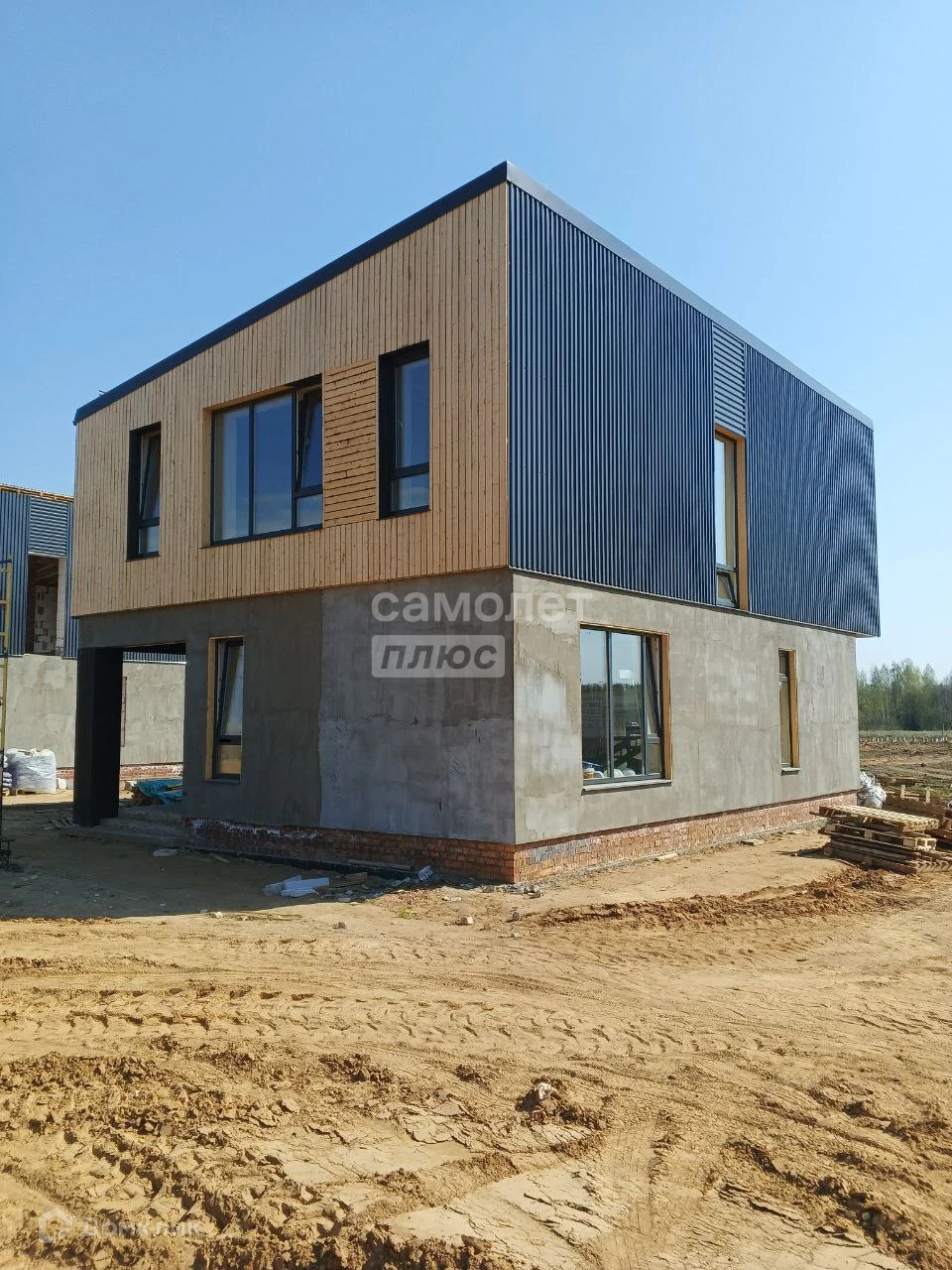 Стены дома выполнены из газобетонных блоков Bonolit, утеплены минеральной ватой. Крыша односкатная, утеплённая, с металлической водосточной системой и выводом в ливневую канализацию. Отмостка вокруг дома выполнена, установлены большие энергосберегающие окна. Фундамент свайный, фасад обшит строганной доской, оштукатурен и покрашен декоративной фасадной краской. Участок огорожен забором в едином стиле для всего посёлка.