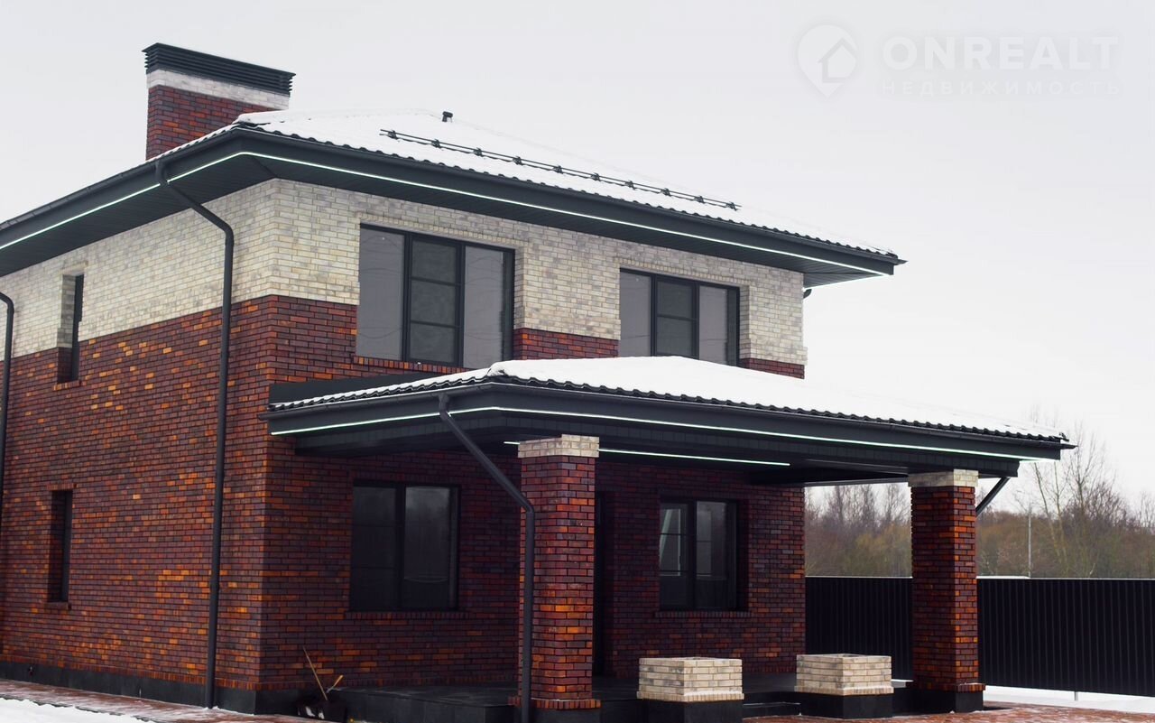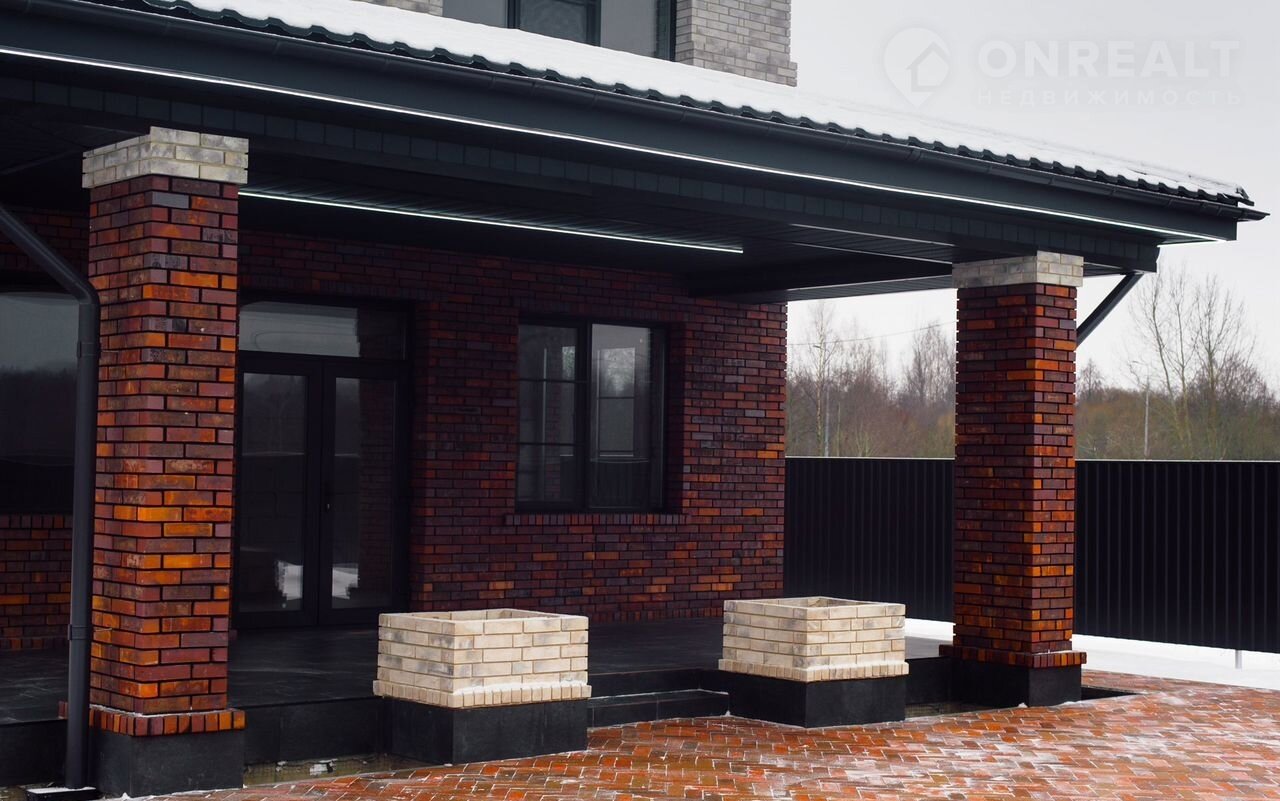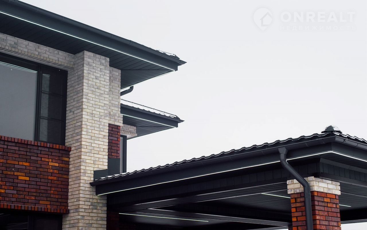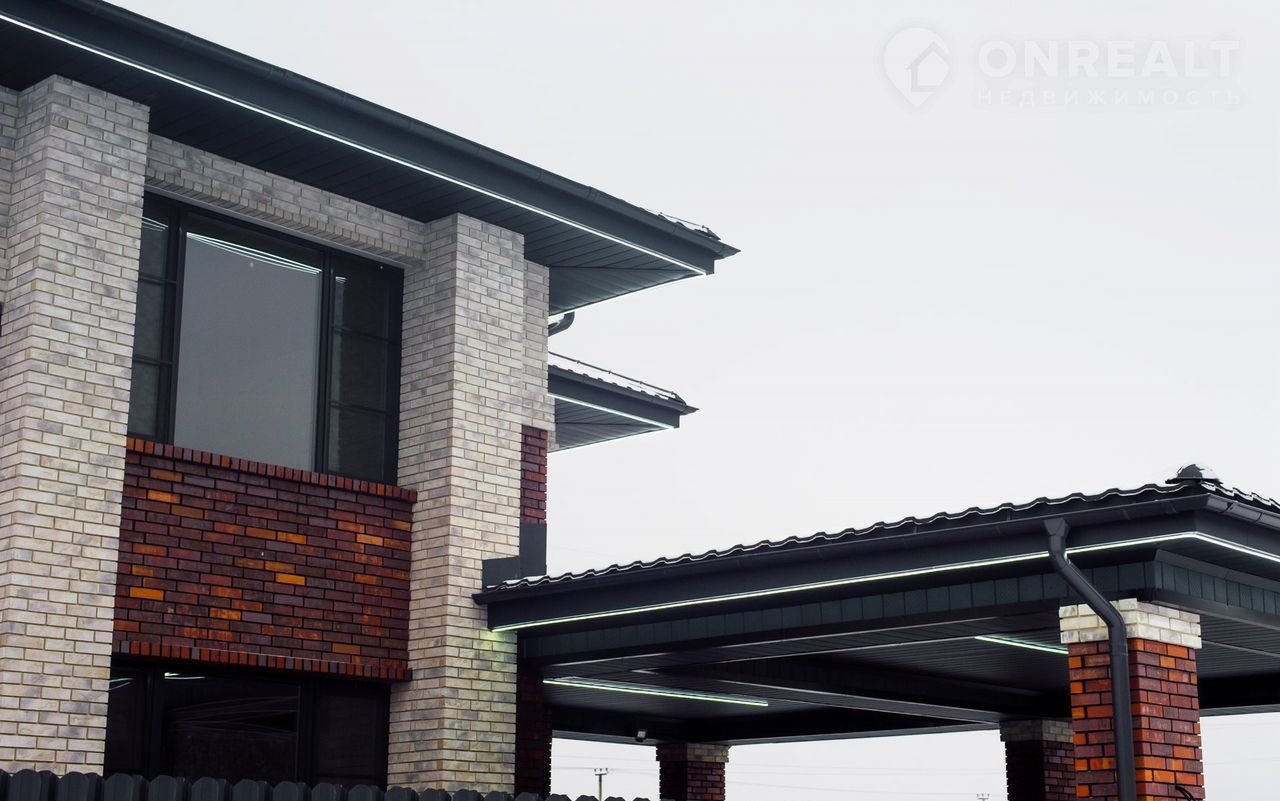Отмостка утеплена. Цоколь утеплен и отделан керамогранитом. Фасад дома украшает темный клинкерный кирпичом «Skriаbin Сеrаmiсs» (5 сортировка) и светлым клинкером «rеаl brеаk». По периметру дома установлена светодиодная подсветка, создающая современную и уютную атмосферу в ночное время.