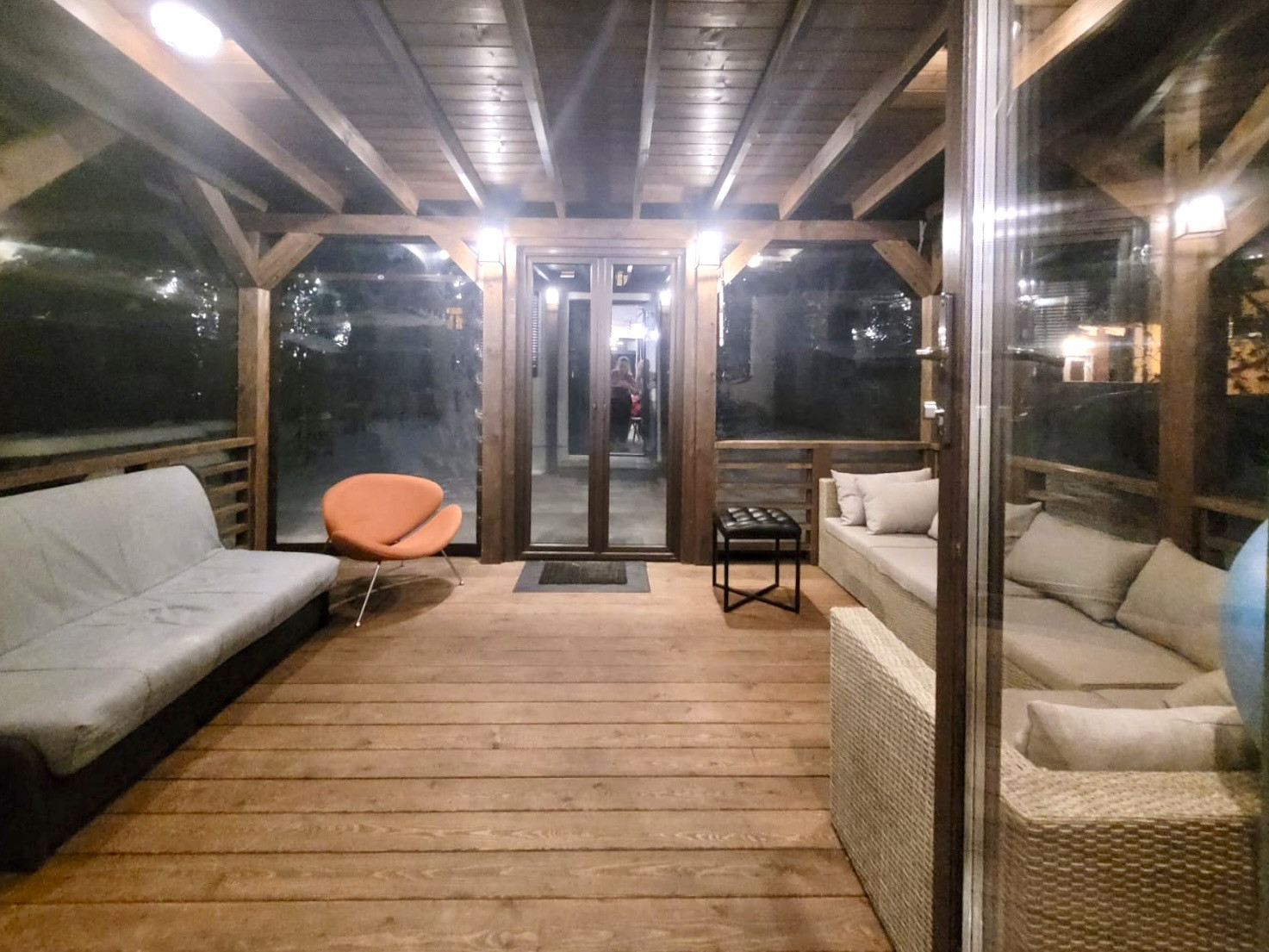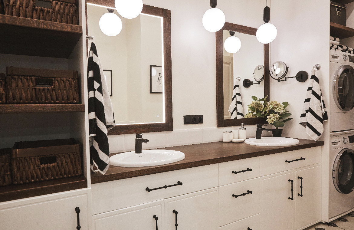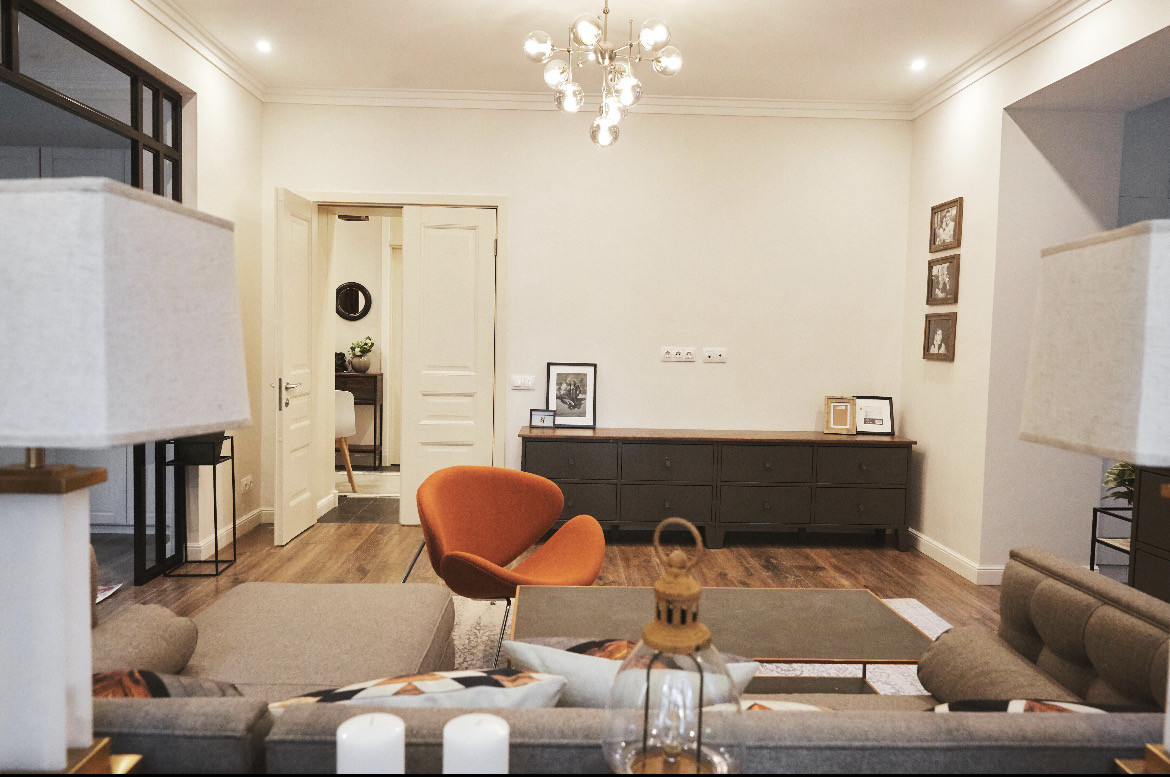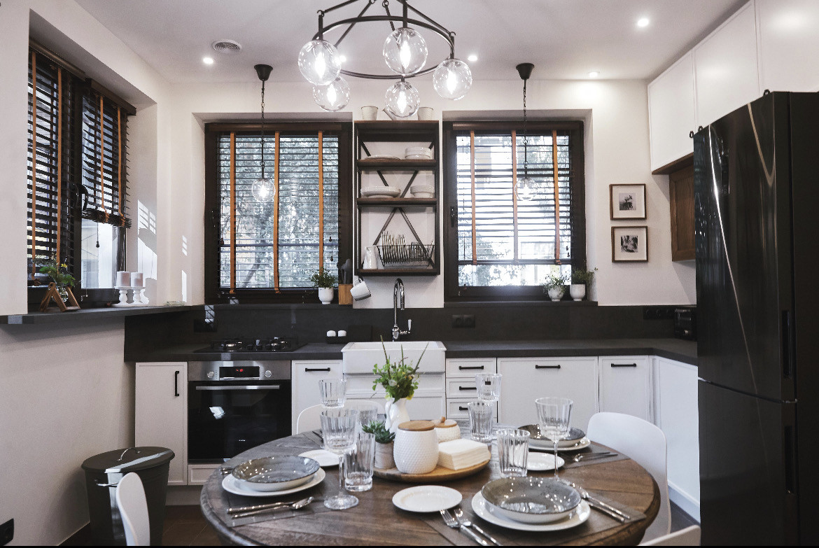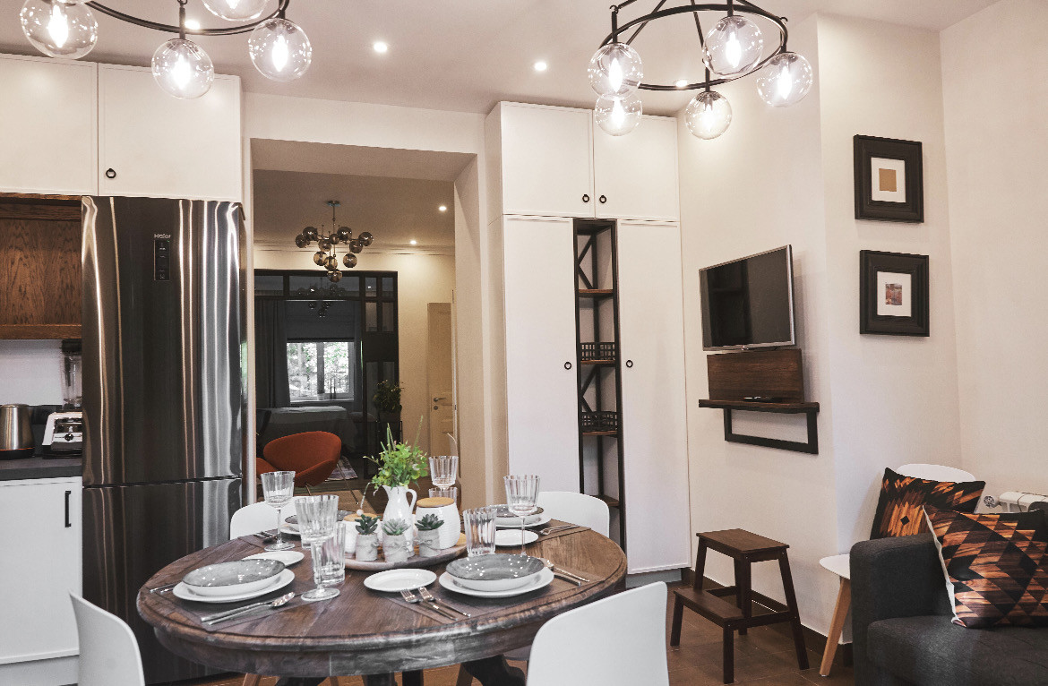 В квартире одна взрослая спальня, две детские комнаты отделены коридором со своим с/у. Большая гостиная с ТV, кухня-столовая обустроена современной и экологичной мебелью, есть вся необходимая встраиваемая бытовая техника: посудомоечная, стиральная, сушильная машины, варочная панель и духовка (газ), холодильник. Из кухни выход на патио/веранду с диванами для отдыха и выходом на свой внутренний благоустроенный дворик. В доме есть погреб, большой теплый балкон.
