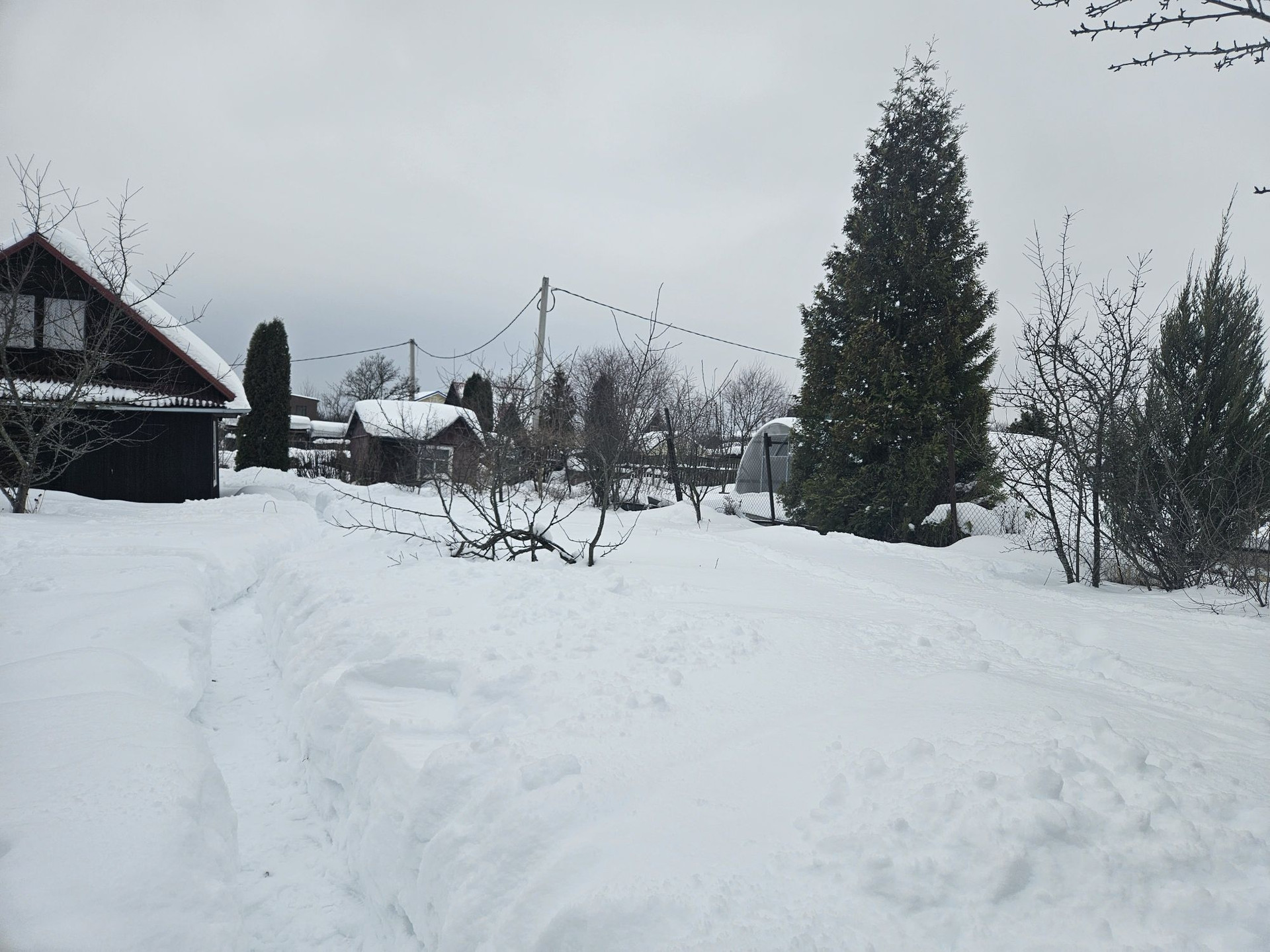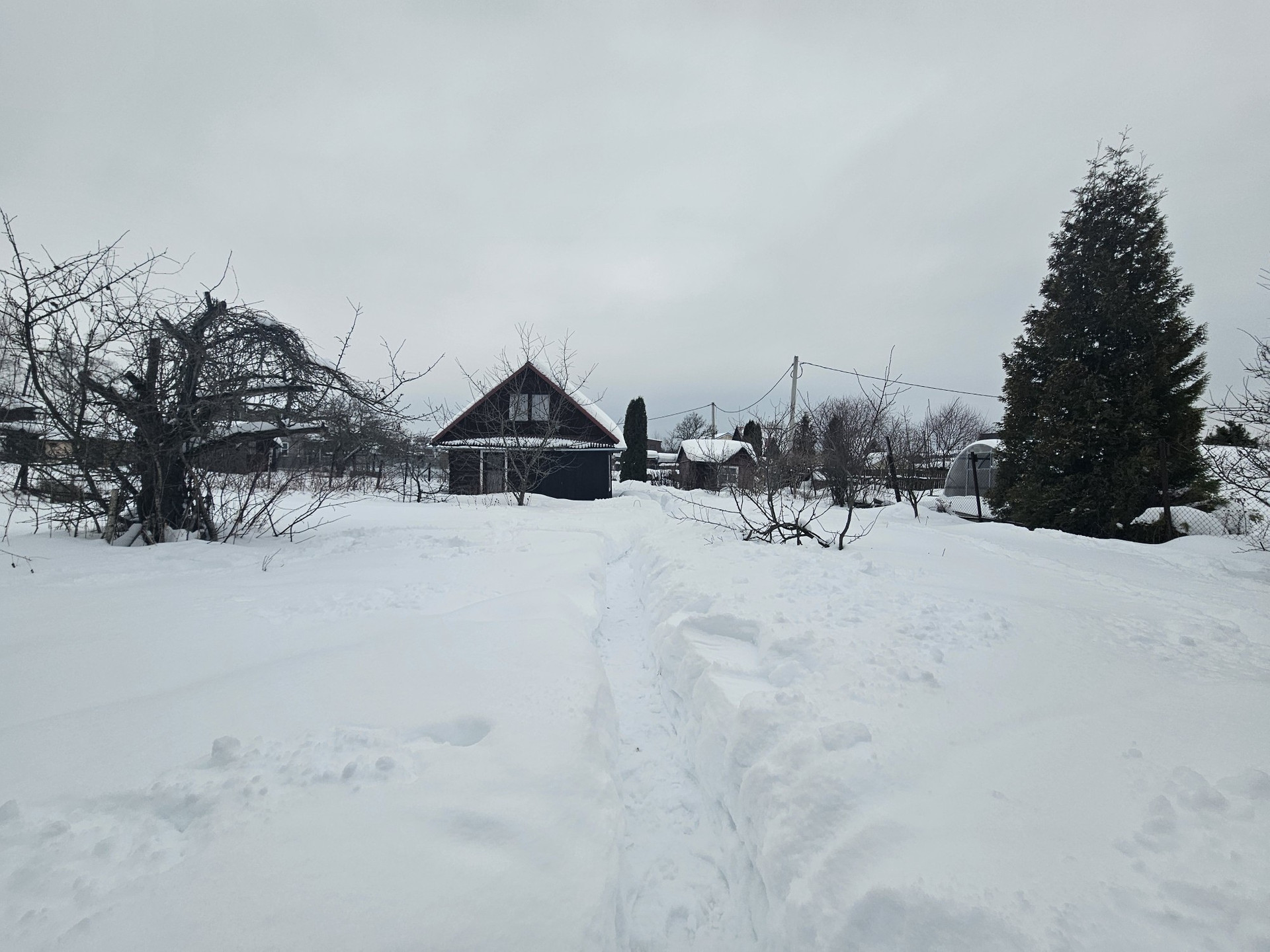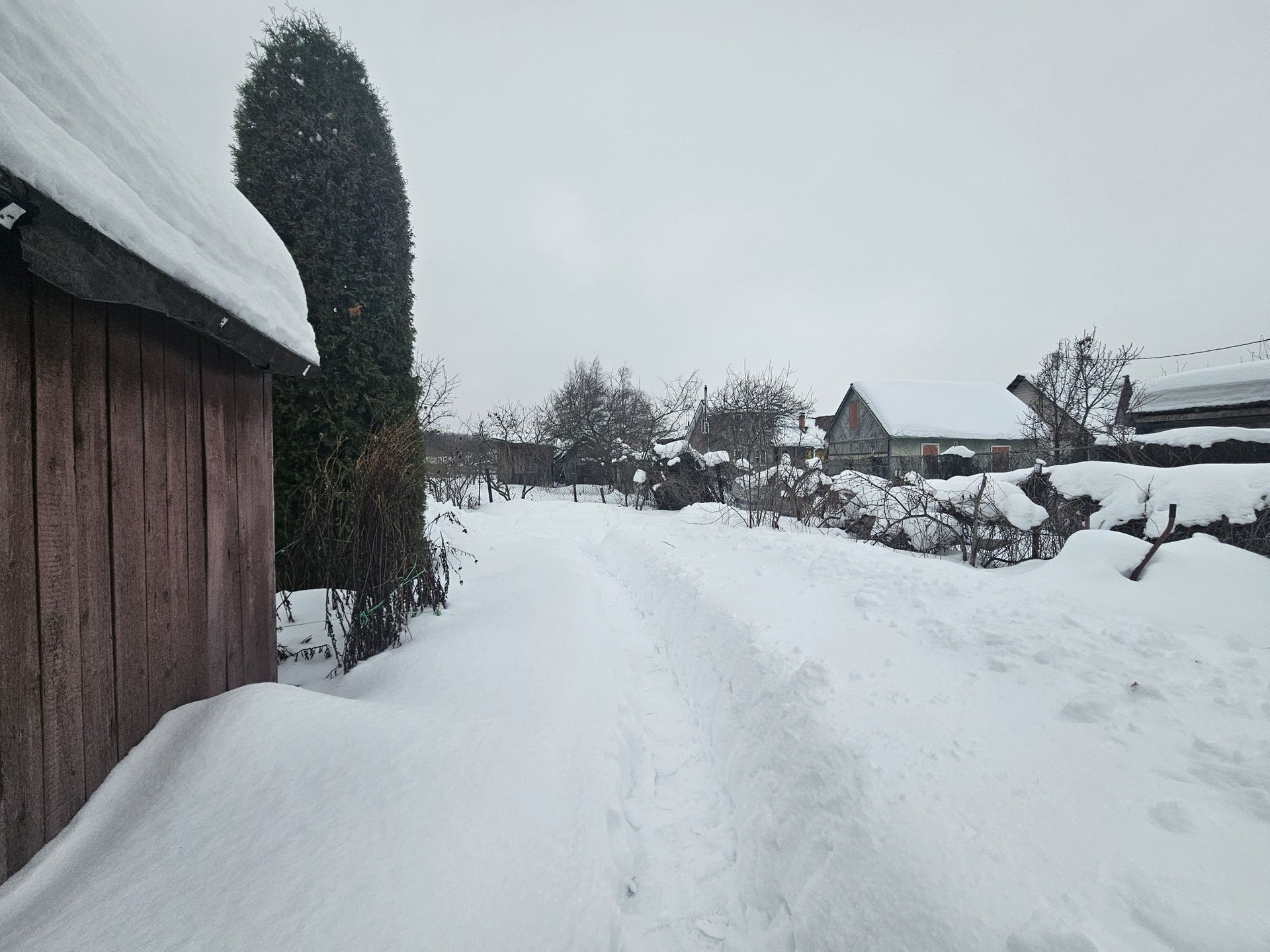 Участок правильной формы разработан и ухожен: с газоном, цветами, плодовыми кустами и деревьями. Есть два строения: сарай(2×3) и сруб с пристройкой(3×5м), по периметру новый забор из профлиста.  Электричество 5кВт, летний водопровод для полива. Участок расположен в конце улицы, поэтому мимо участка никто не ездит, а летом всегда есть три парковочных места и прекрасный подъезд для строительной техники. Дороги чистят круглогодично. Все соседи дружелюбные и спокойные. Тихо и живописно.