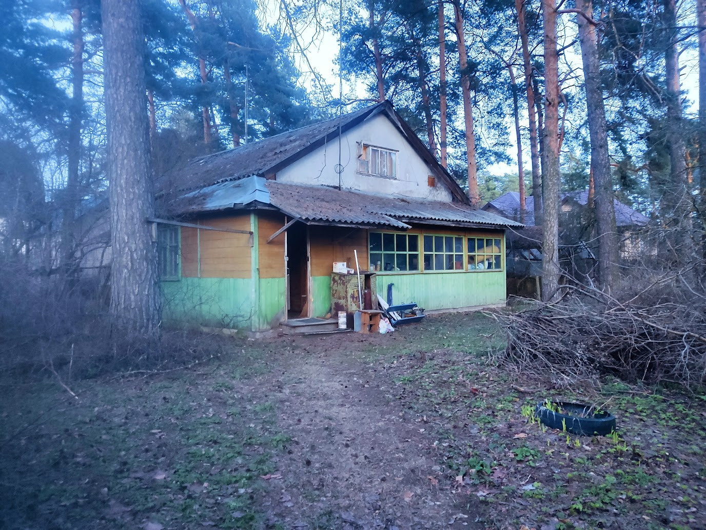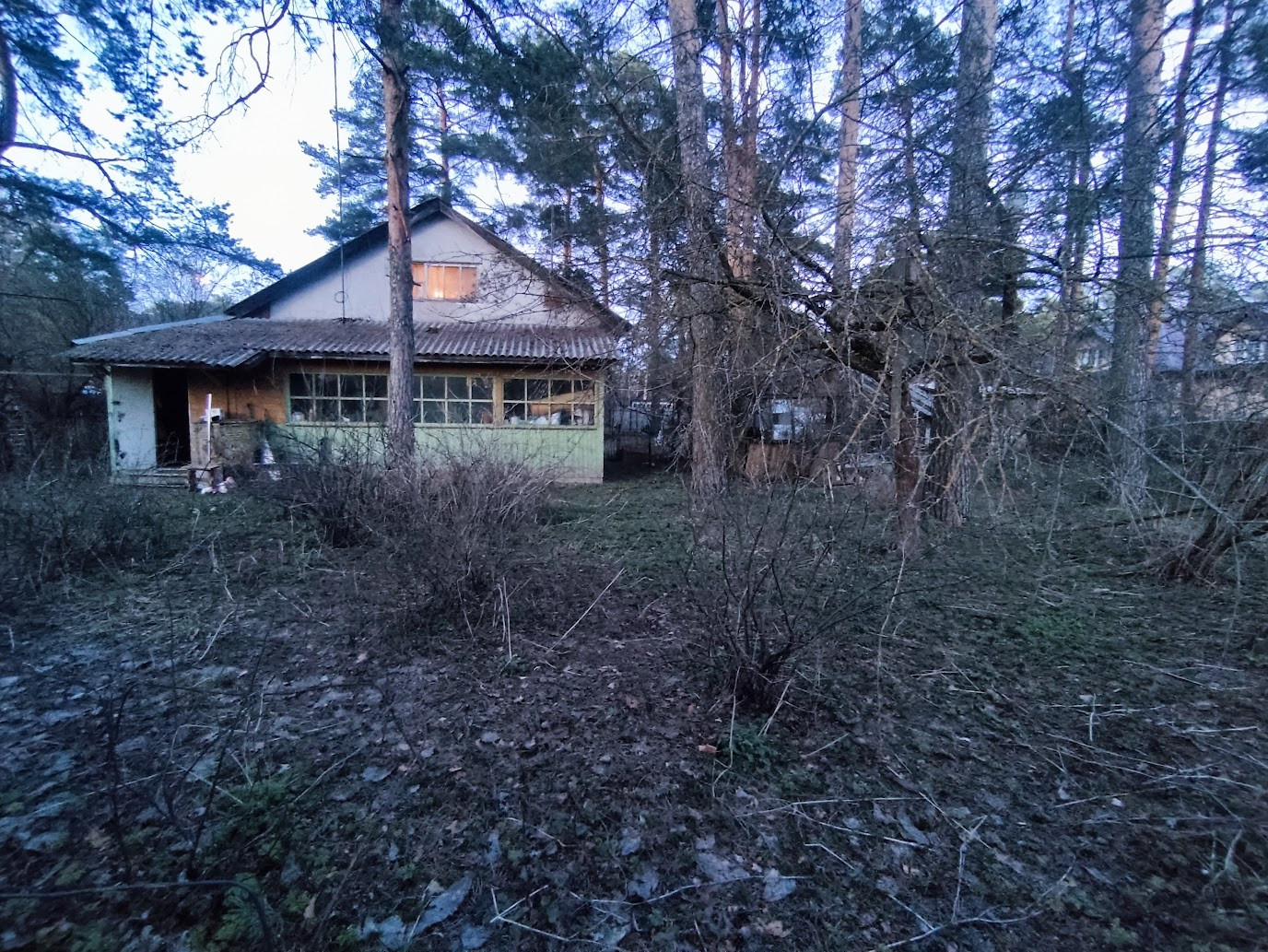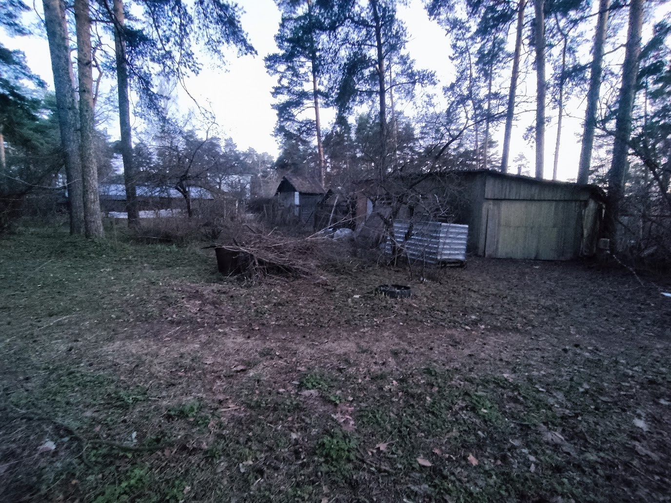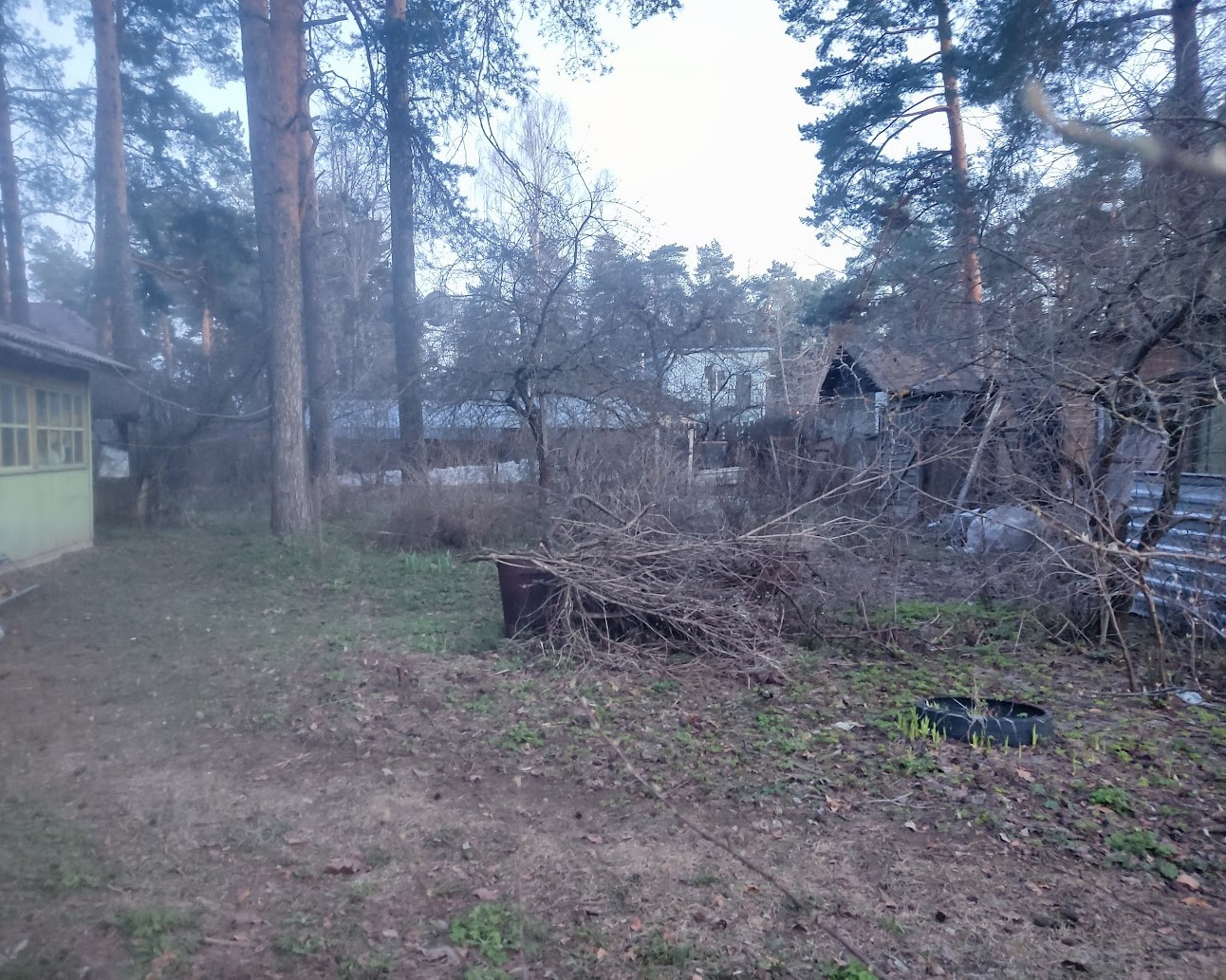 Участок с соснами, яблонями, плодоносящими кустарниками (смородиной, крыжовником).