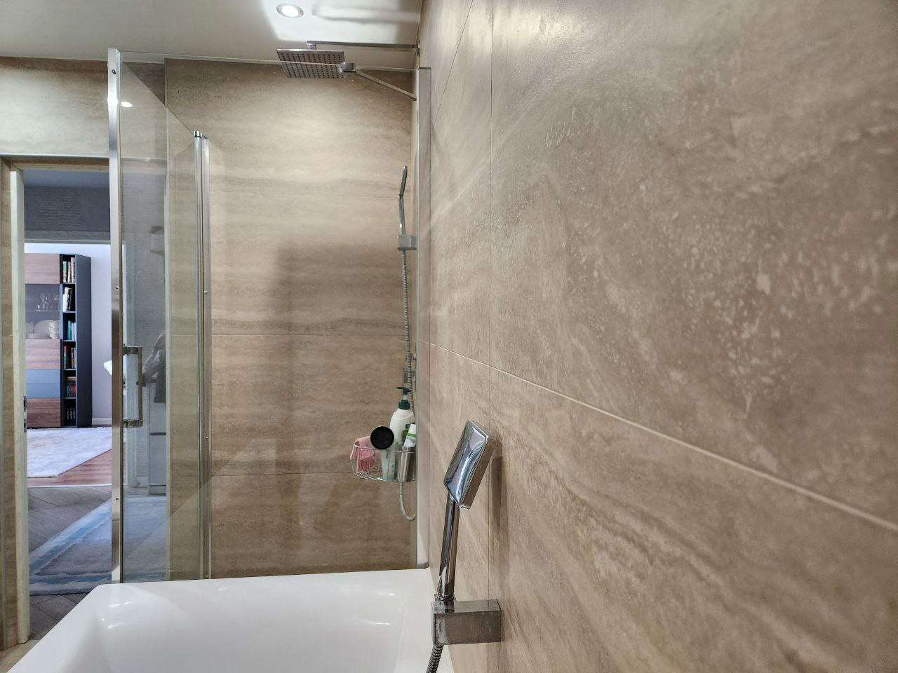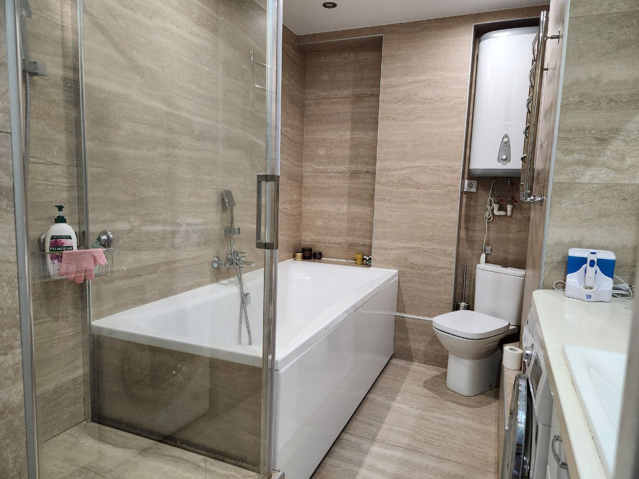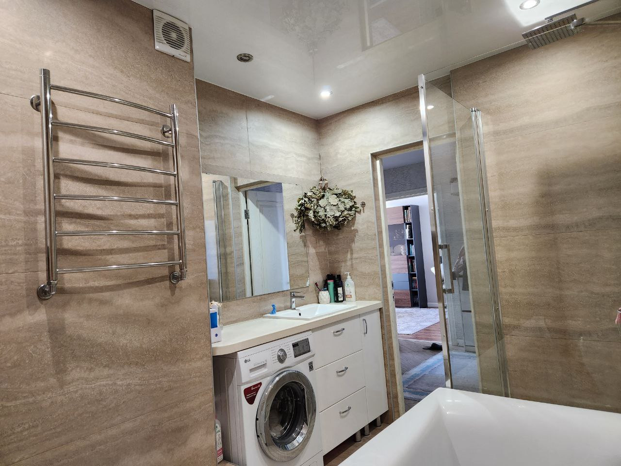✅️Вся ванная 7 кв.м. выложена из керамогранита единым полотном с рисунком, столешница из жидкого камня, шкафчики и тумба с доводчиками blum. Стеклянная душевая кабина и ванная двухсторонняя 190см. Установлен водонагреватель Еlесtrоluх на случай отключения горячей воды. Вся сантехника Германия, керамогранит КЕRАМА МАRАZZI.