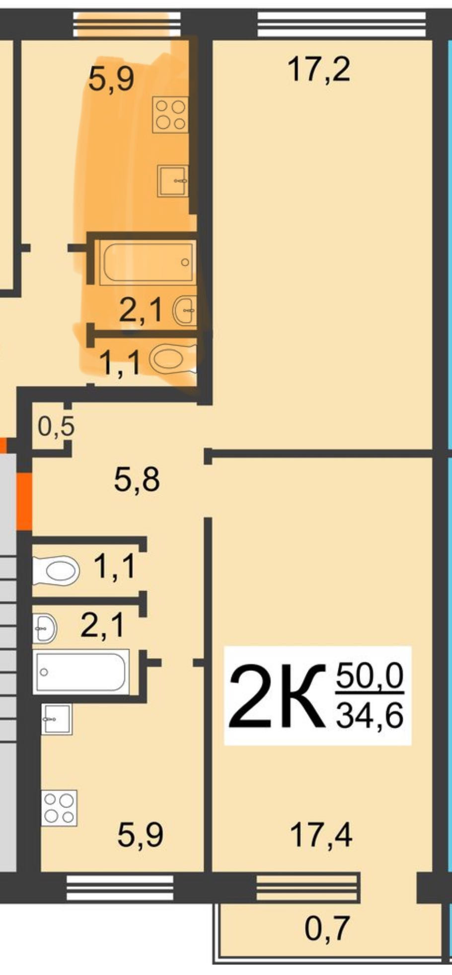 Просторные комнаты по 17.4 м²