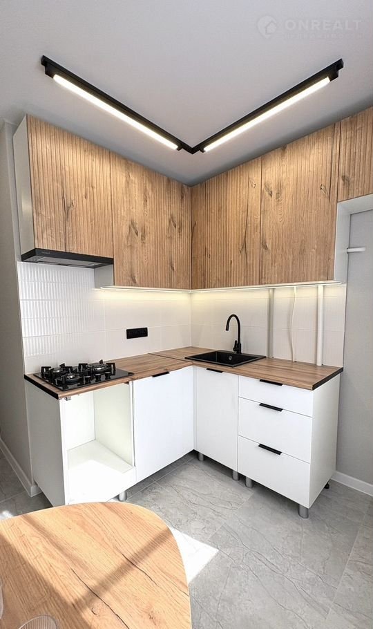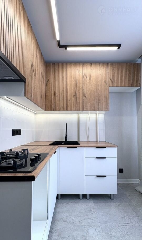 Кухня со встроенной техникой, и местом под холодильник и посудомоечную машину.