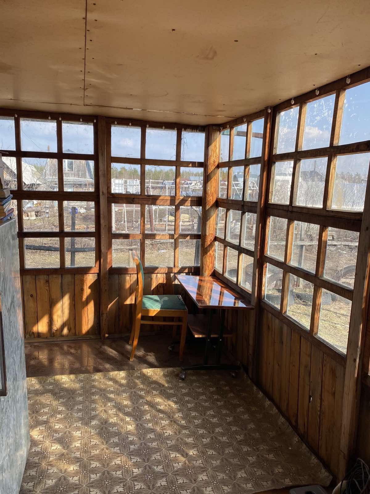 Внутри есть печка . Застекленная веранда.