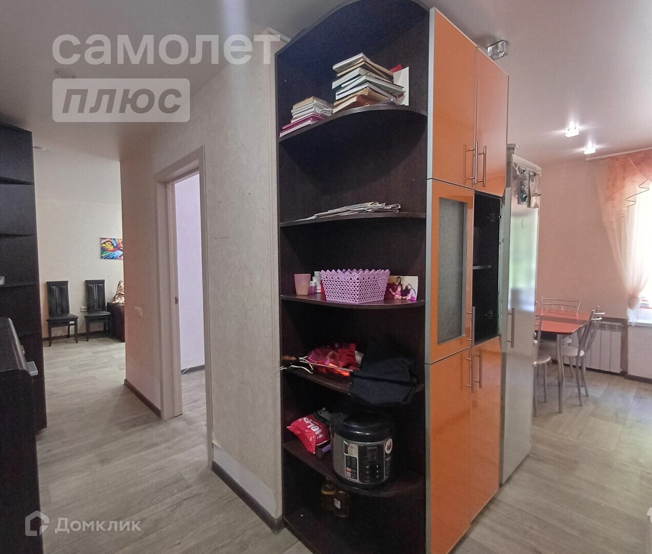 Из мебели: шкаф-гардеробная, 2 дивана, кровать, кухонный гарнитур, стол, стулья.