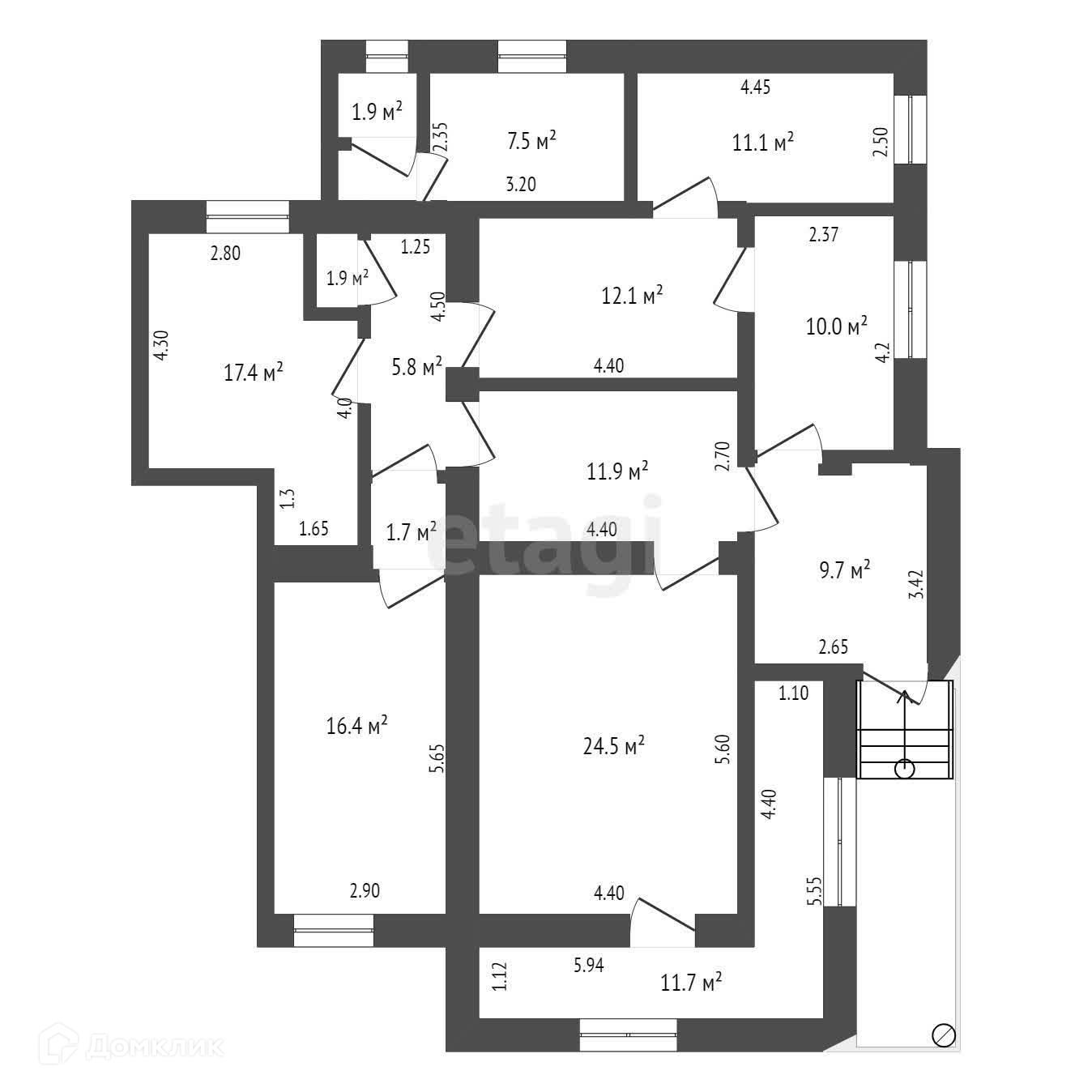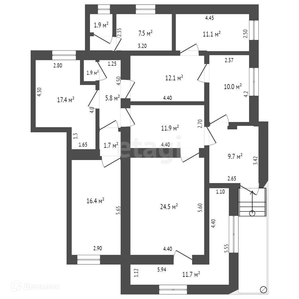 Просторные комнаты: спальни 17,4 кв.м., 12,1 кв.м., 11.1 кв.м.; гостиная 24,6 кв.м.; кабинет 10.0 кв.м. Кухня 16.,4 кв.м. Удобная терраса 11,7 кв.м. с отоплением. Санузел совмещен, 7.5 кв.м.