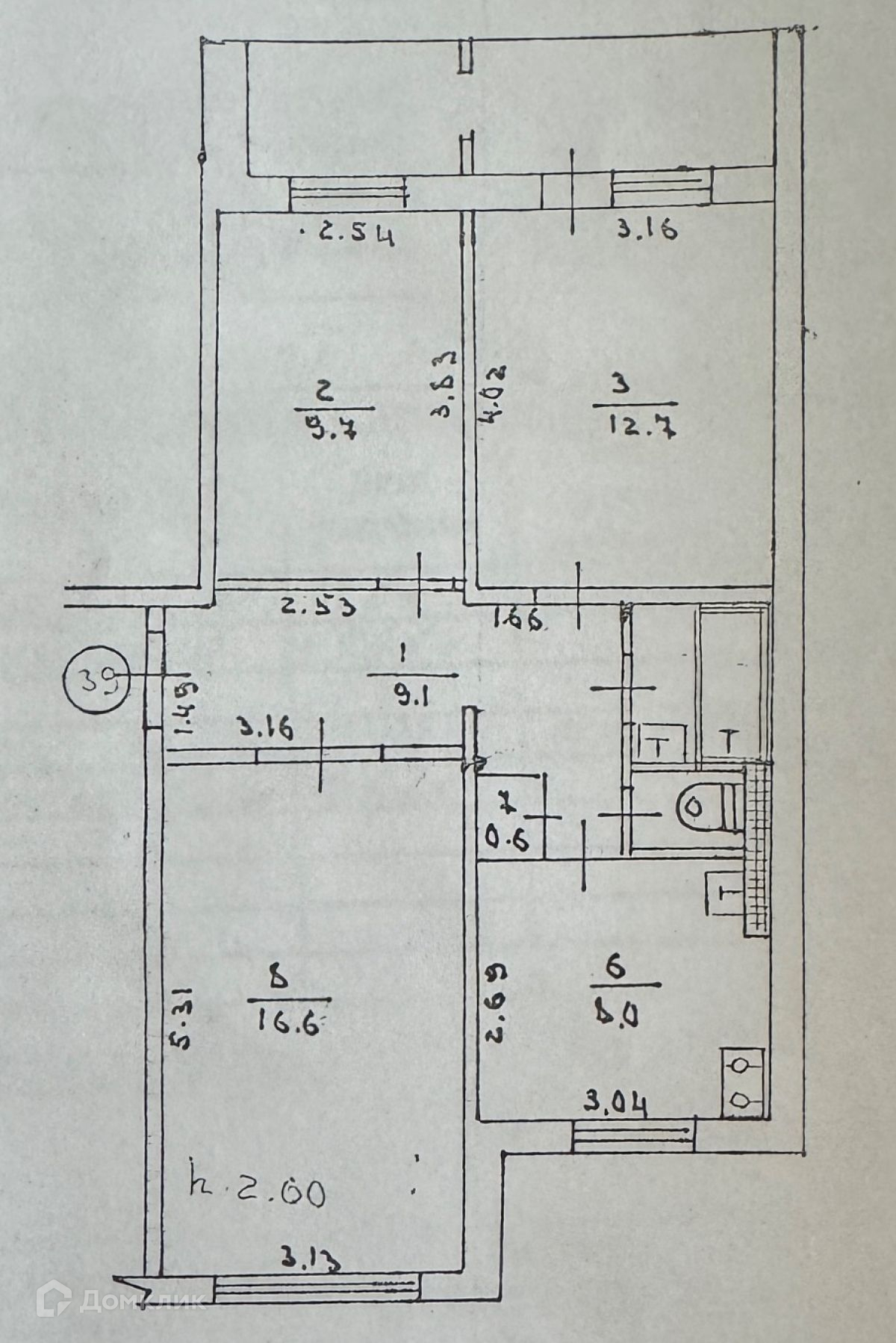 Три комнаты: 16.6 м², 12.7 м², 9.7 м², кухня - 8.0 м², коридор - 9.1 м².