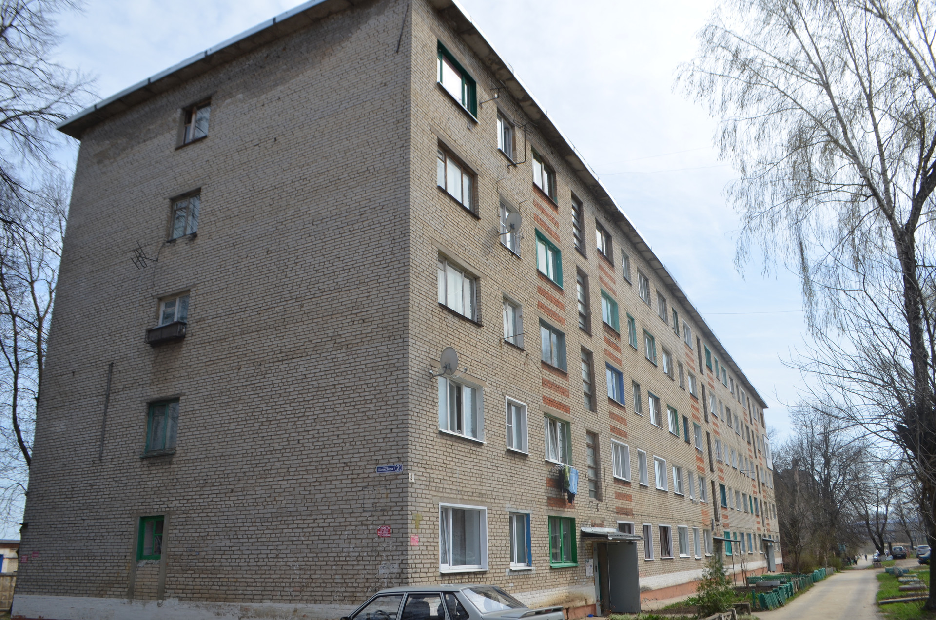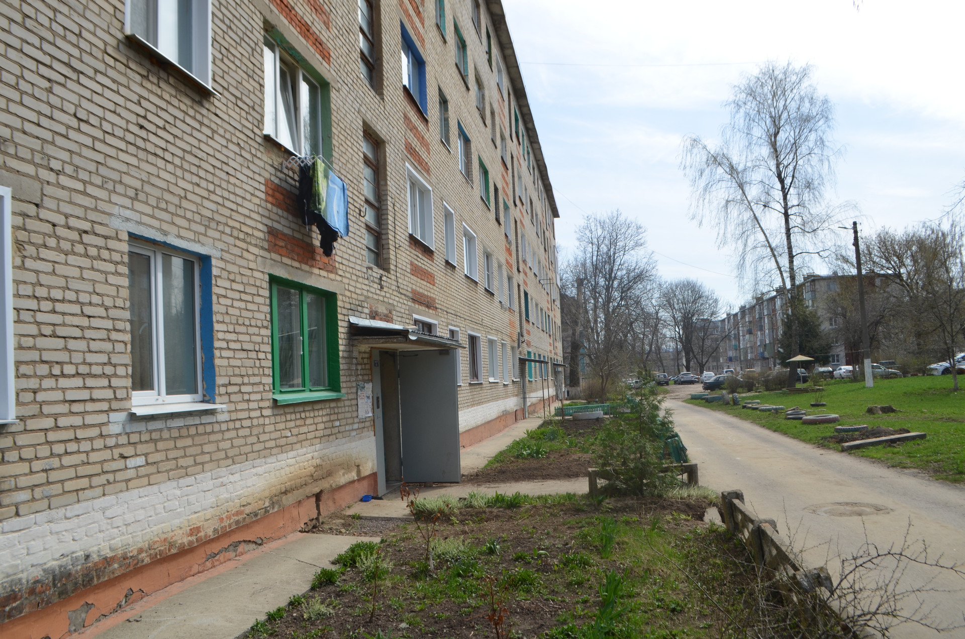 Во дворе общежития есть парковка для автомобилей и не далеко детская площадка.