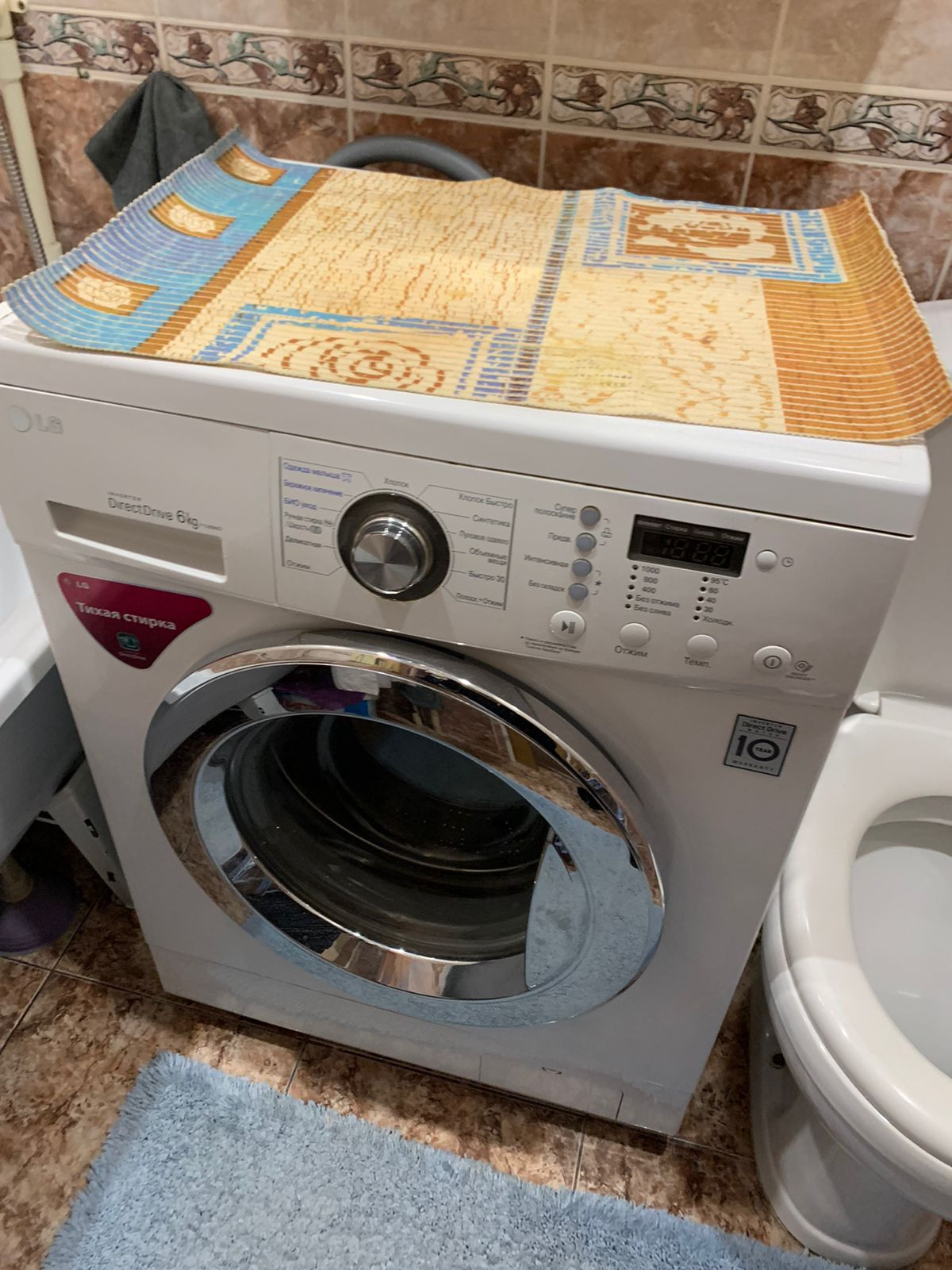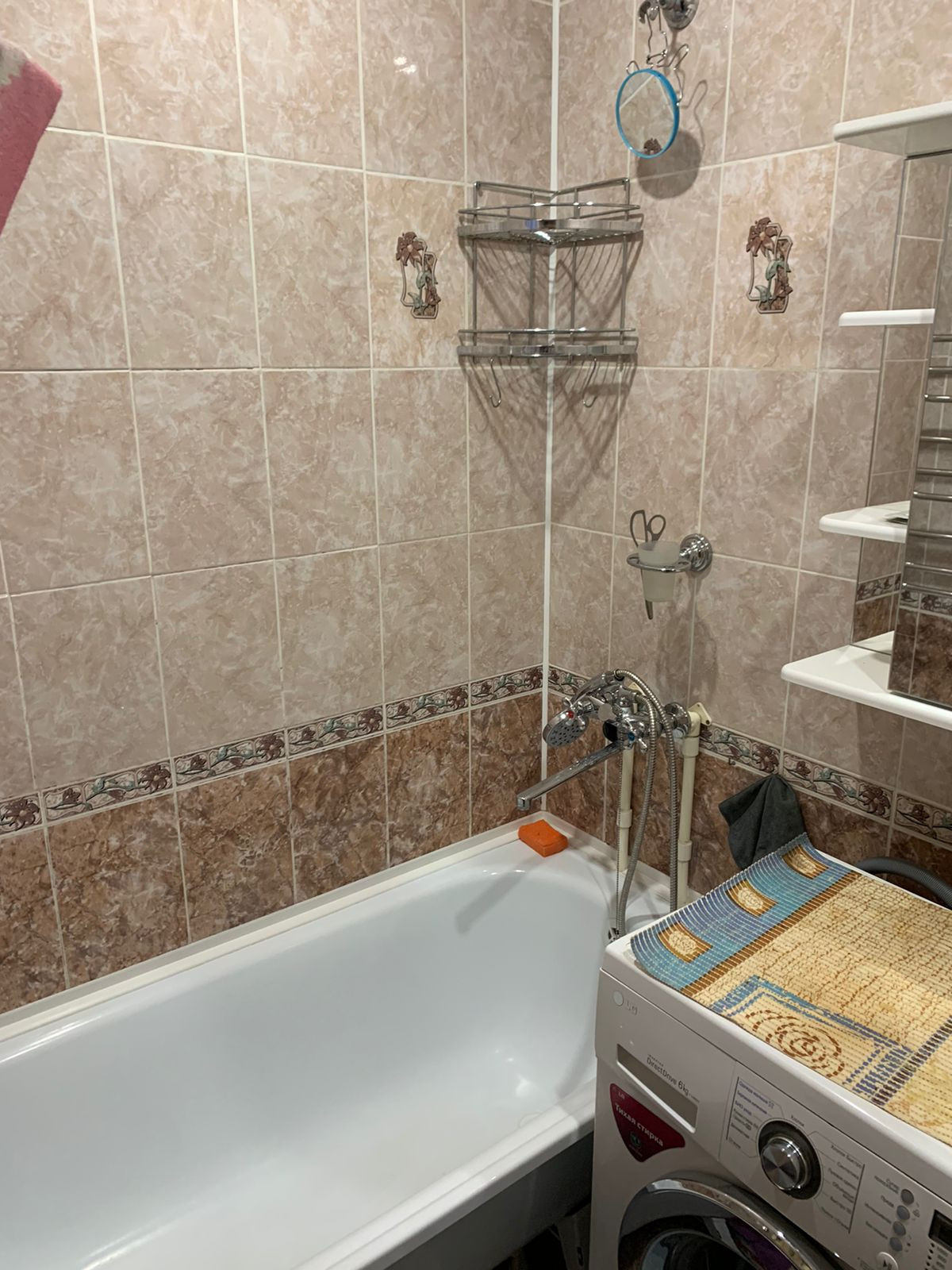 Стиральная машина новая, установлена в ванной комнате.