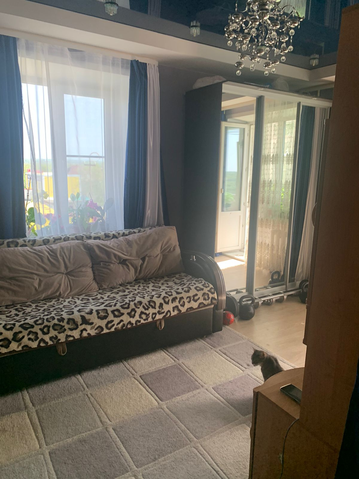 На кухне потолок натяжной глянцевый, кухонный фартук выложен плиткой, кухонный гарнитур при продаже остается в квартире.