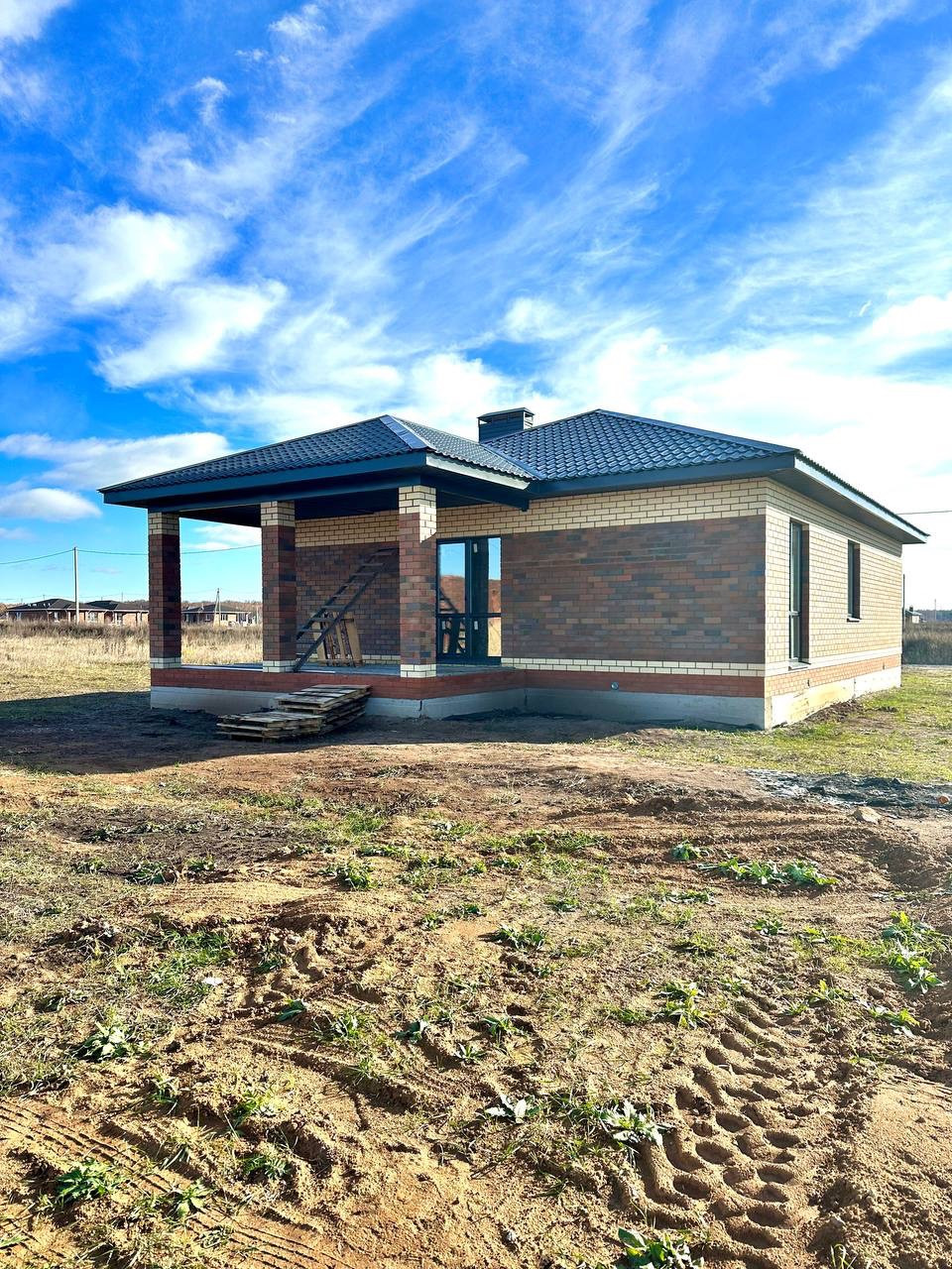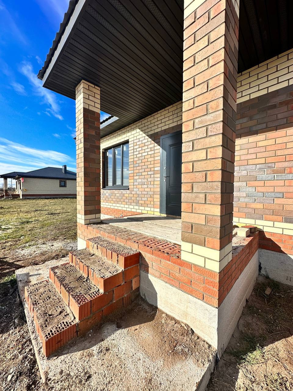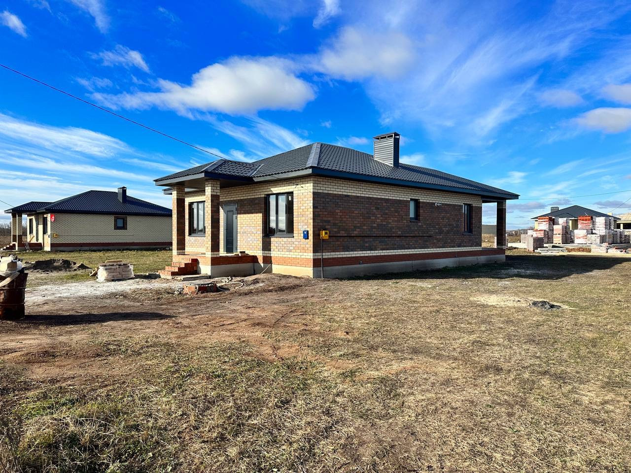 Материал стен керамический кирпич, фасад облицовочный кирпич, фундамент ленточный на сваях, окна тройной стеклопакет, крыша металлочерепица.