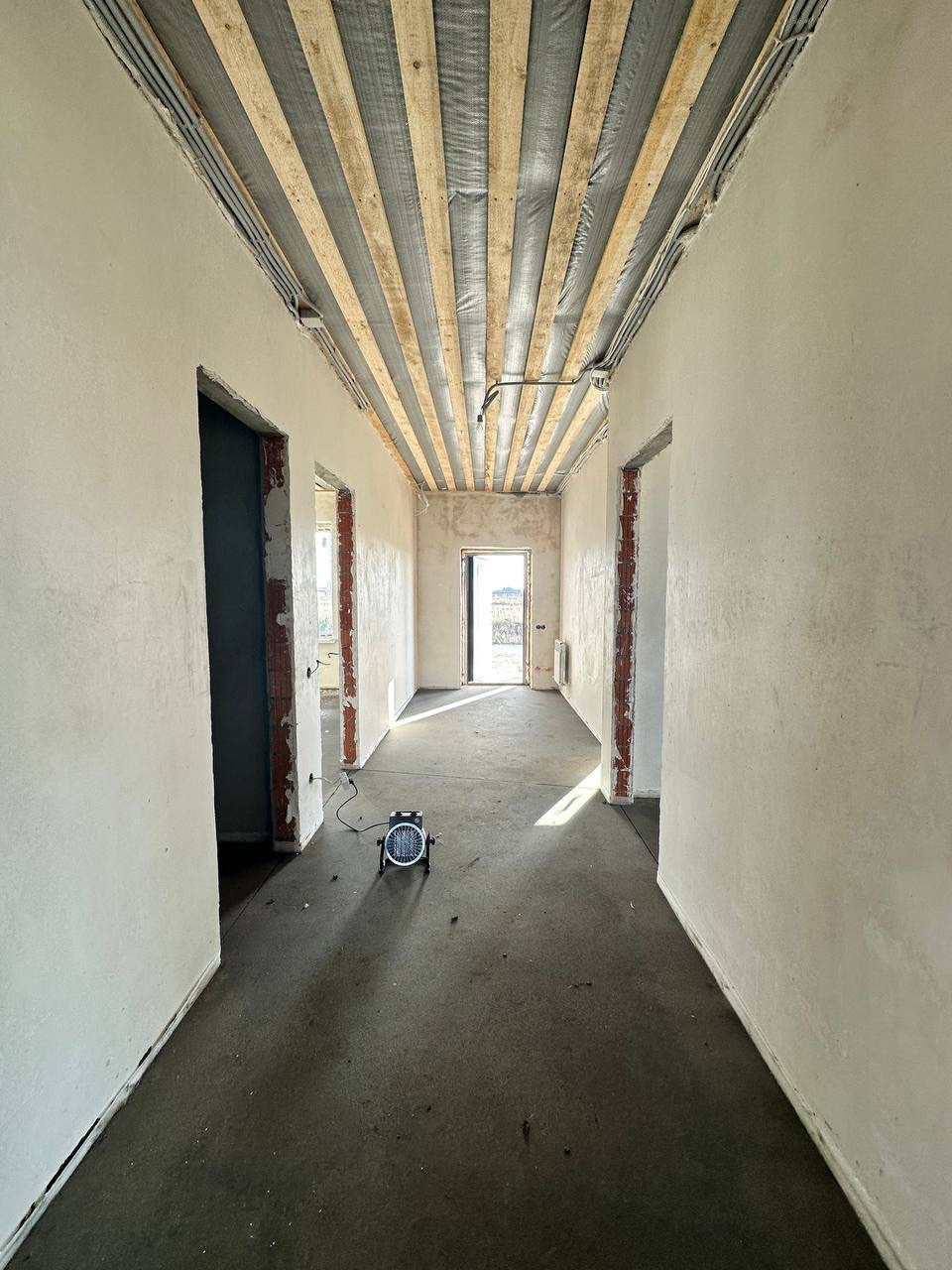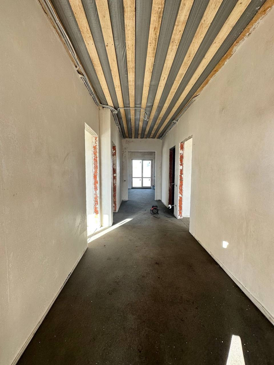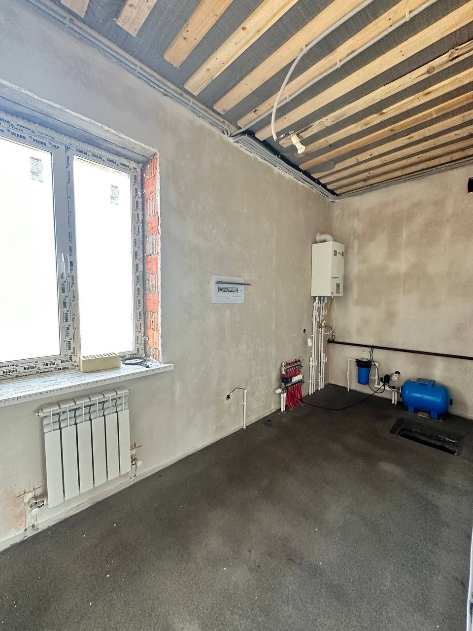 Высота потолков 3 метра, теплые полы по всему дому, радиаторы, стены оштукатурены и ошпатлеваны, электроразводка, полусухая стяжка пола, установлен газовый котел, хорошая металлическая входная дверь.