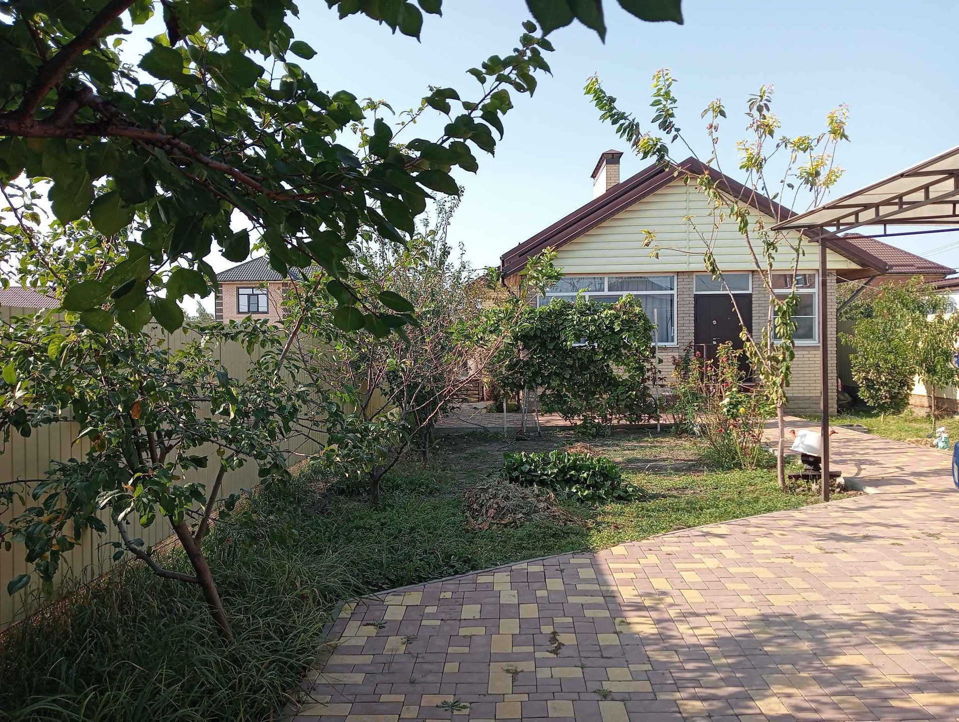 Продам дом, 4 комнаты, кухня 18м.кв., три раздельные спальни и гостиная, санузел совмещëн, есть подвал 20м.кв., вход внутри дома, на участке расположен гараж 6*4, с автоматическими ролетными воротами, летний душ, навес 6*6, во дворе места для двух машин, двор в плитке, въездные ворота во двор автоматические, посажены плодовые деревья, виноградник.