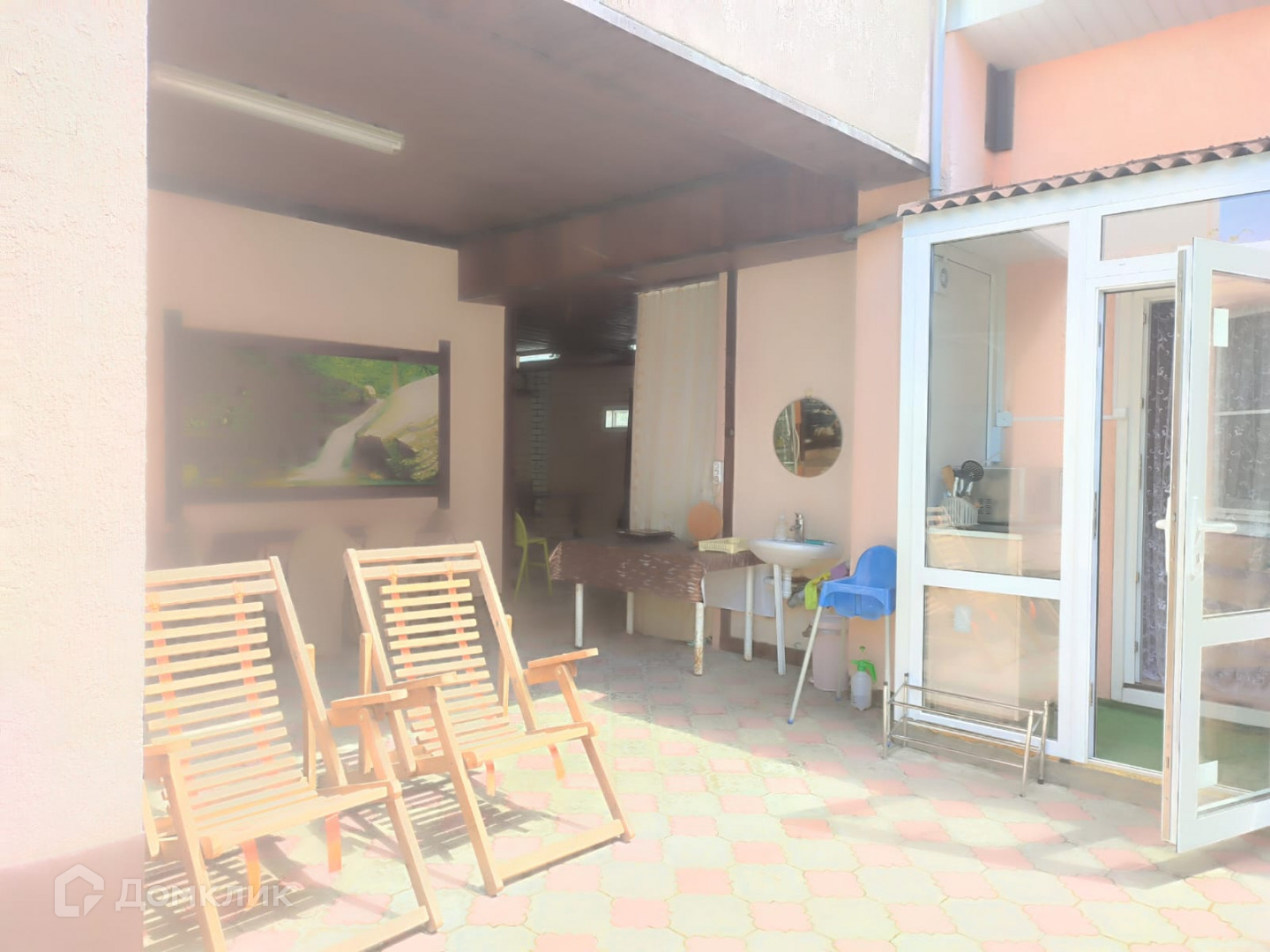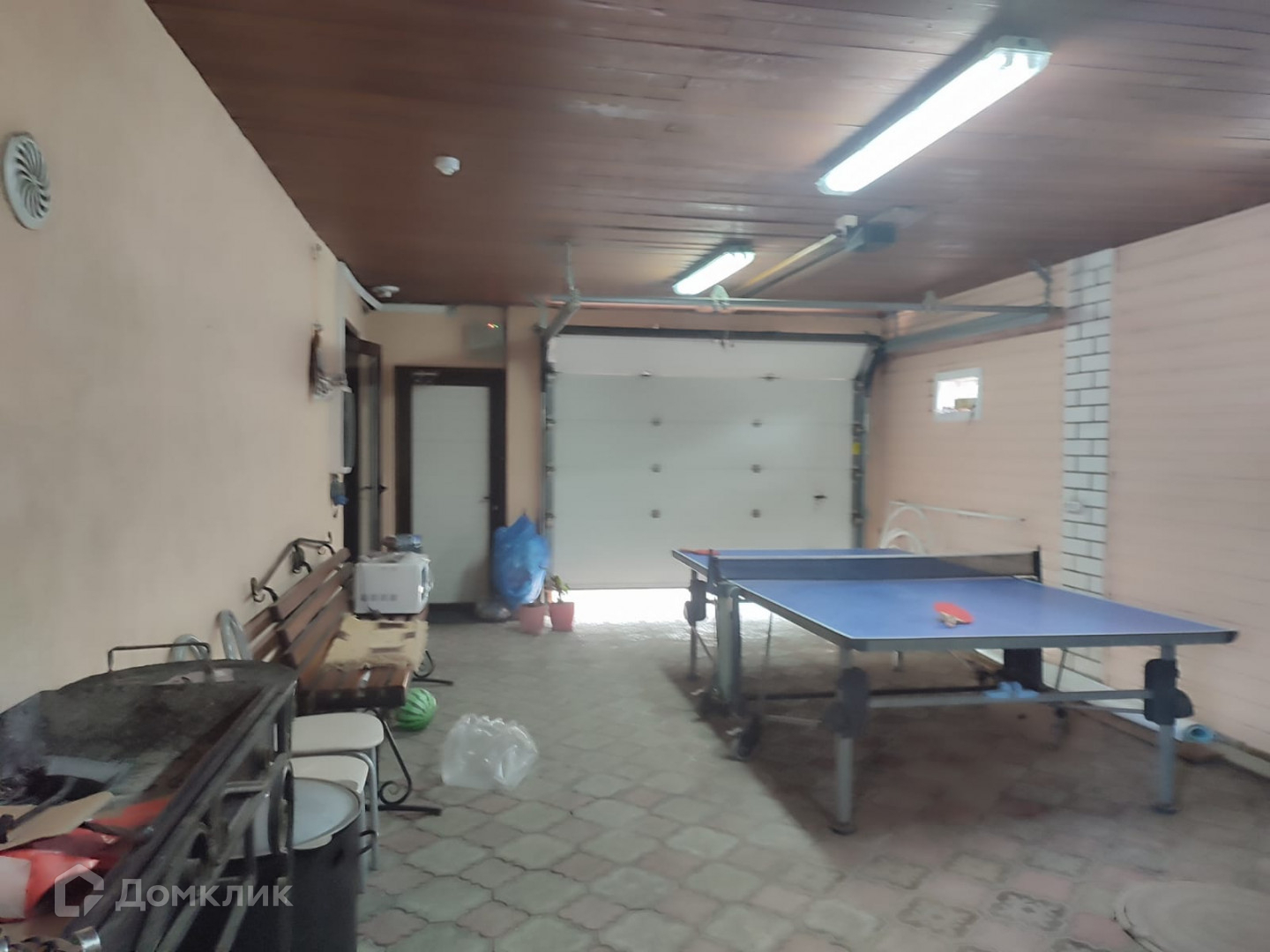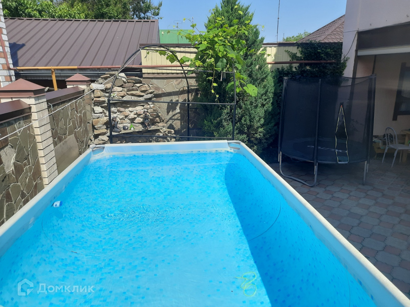 На участке, отделанном плиткой, расположены отапливаемый гостевой домик, терраса, кухонная зона, бассейн и фонтан. Дом оснащен оптоволоконным интернетом и оборудован системой видеонаблюдения.