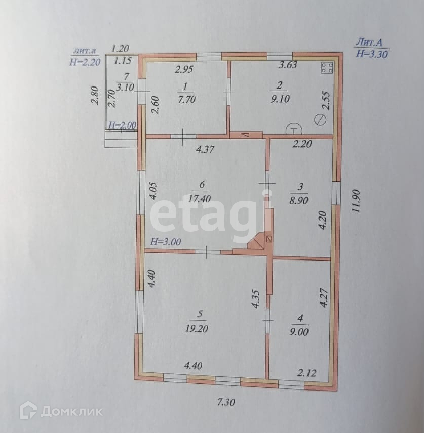 Строение блочно-щитовое, обложенное кирпичом. Состоит из 4 комнат: 19.2 м2, 17.4 м2, 9 м2, 8.9 м2, кухня 9.1 м2, коридор 7.7 м2, веранда 3.1 м2.
