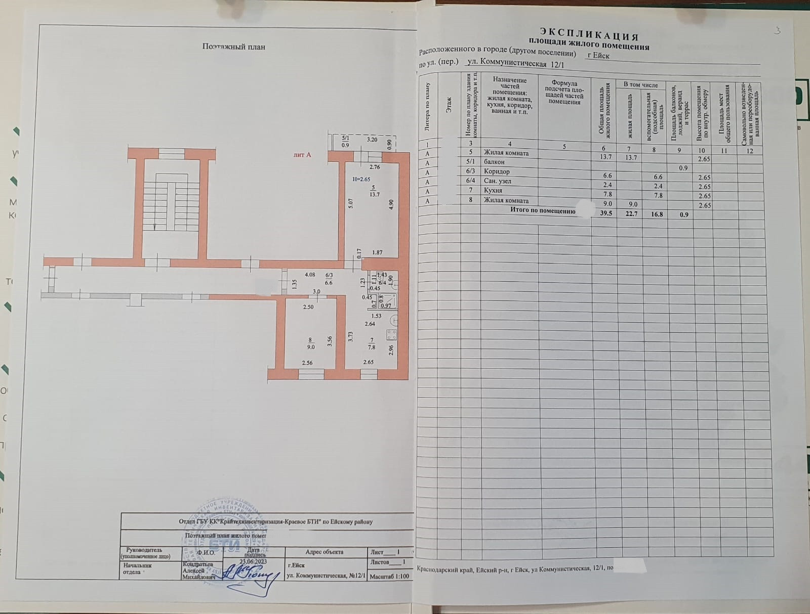 Общая площадь 39.5 м2