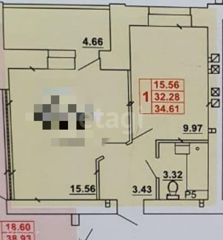 Общая площадь - 32,3 м2, просторная кухня - 10 м2, жилая комната - 15,6 м2.