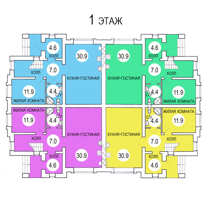В доме 2 этажа. На первом этаже большая кухня-гостиная 30,9 кв м и жилая комната 11,9 кв м, есть санузел 4,4 кв м, холл 7,0 и 4,6 кв м, на втором три спальни 19,9 ; 13,5 ; 11,6 кв м, два санузла 4,2 и 3,6 кв м и гардеробная 6,4 кв. м, холл 4,7 кв.м.