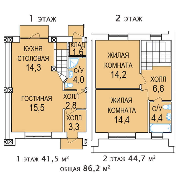 На 1 этаже большая кухня-гостиная 29,8 кв м, санузел 4 кв м, кладовая 1,6 кв м, два холла 3,3 и 2,8 кв м, на 2 этаже две спальни 14,2 и 14,4 кв м, санузел 4,4, холл 6,6.