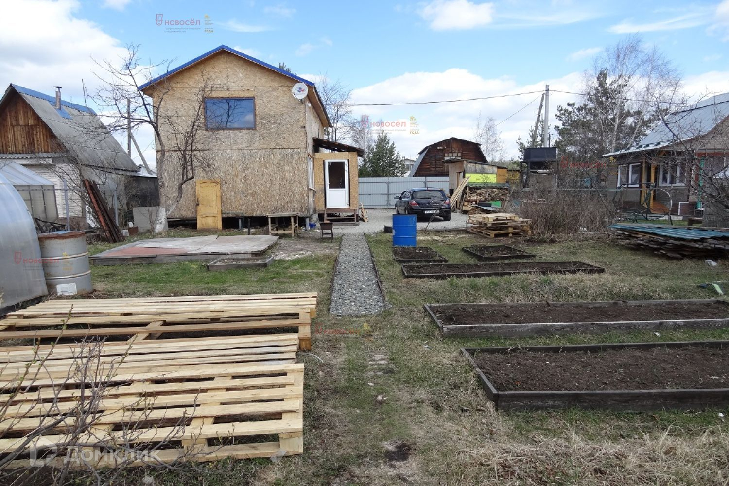 На участке много плодоносящих деревьев-яблоня, вишня, крыжовник, слива, облепиха и др. Теплица.