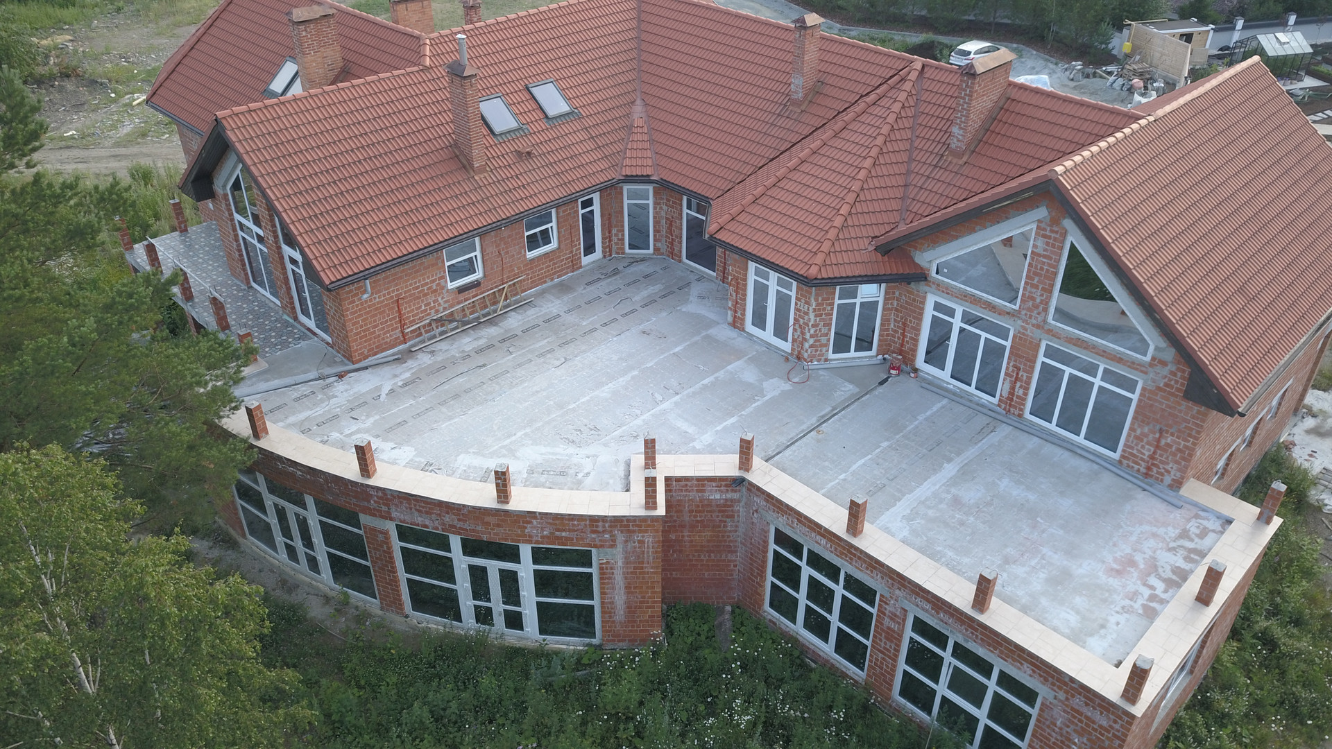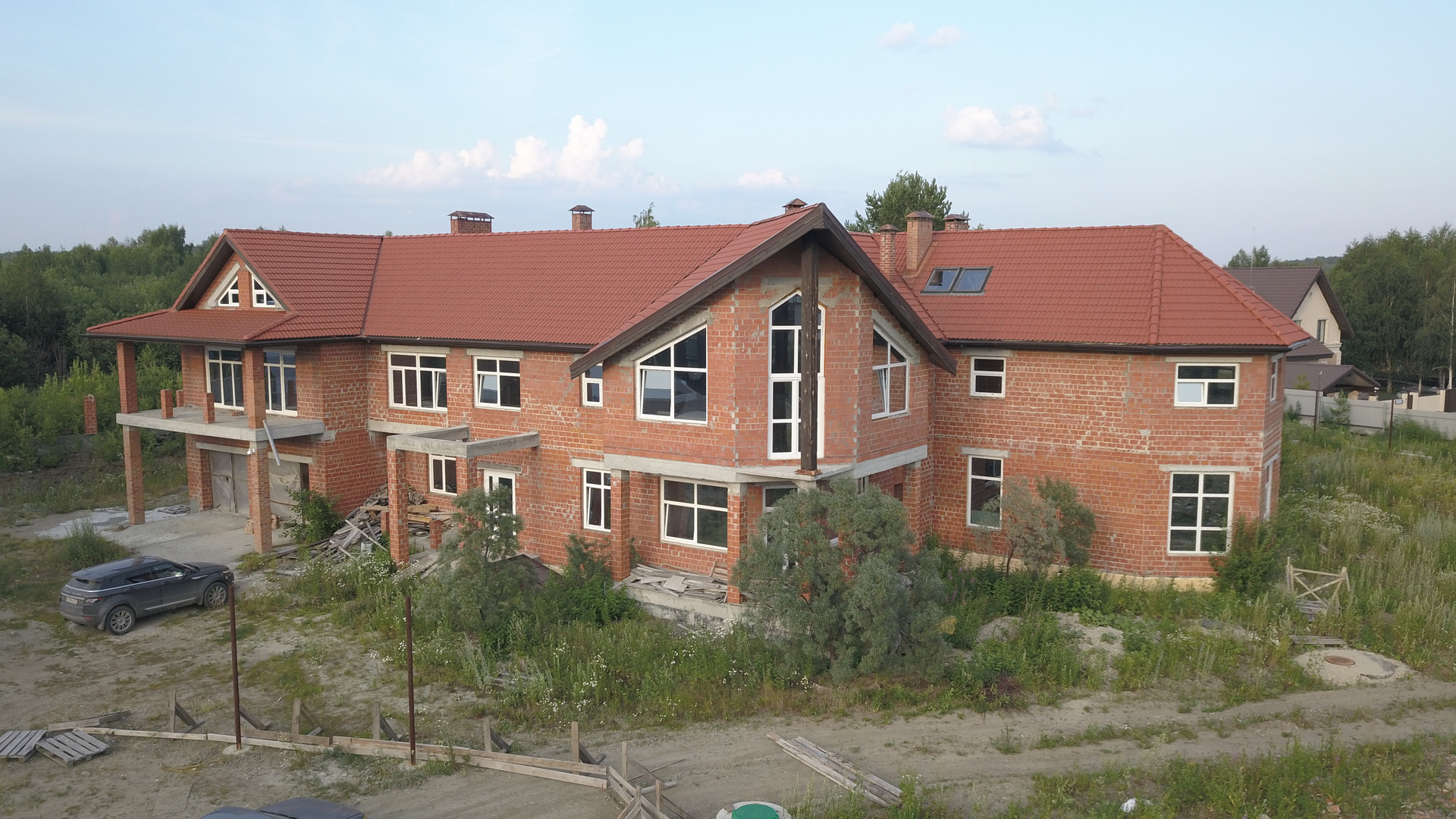 На участке размещены Большой дом – дом из кирпича «Раух» с цокольным этажом под всем зданием (кроме гаража) с высотой потолка 1,8 м, первым этажом с рядом служебных помещений (гараж с мини-мастерской и электрощитовой, котельная), кухней-столовой, бассейном с санузлом, душевой и сауной, гардеробной комнатой, прихожей, большой гостиной с камином, а также комнатой для персонала со своим балконом….