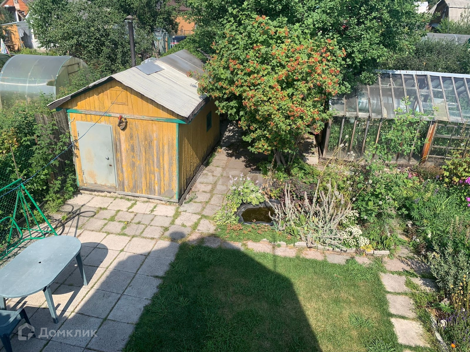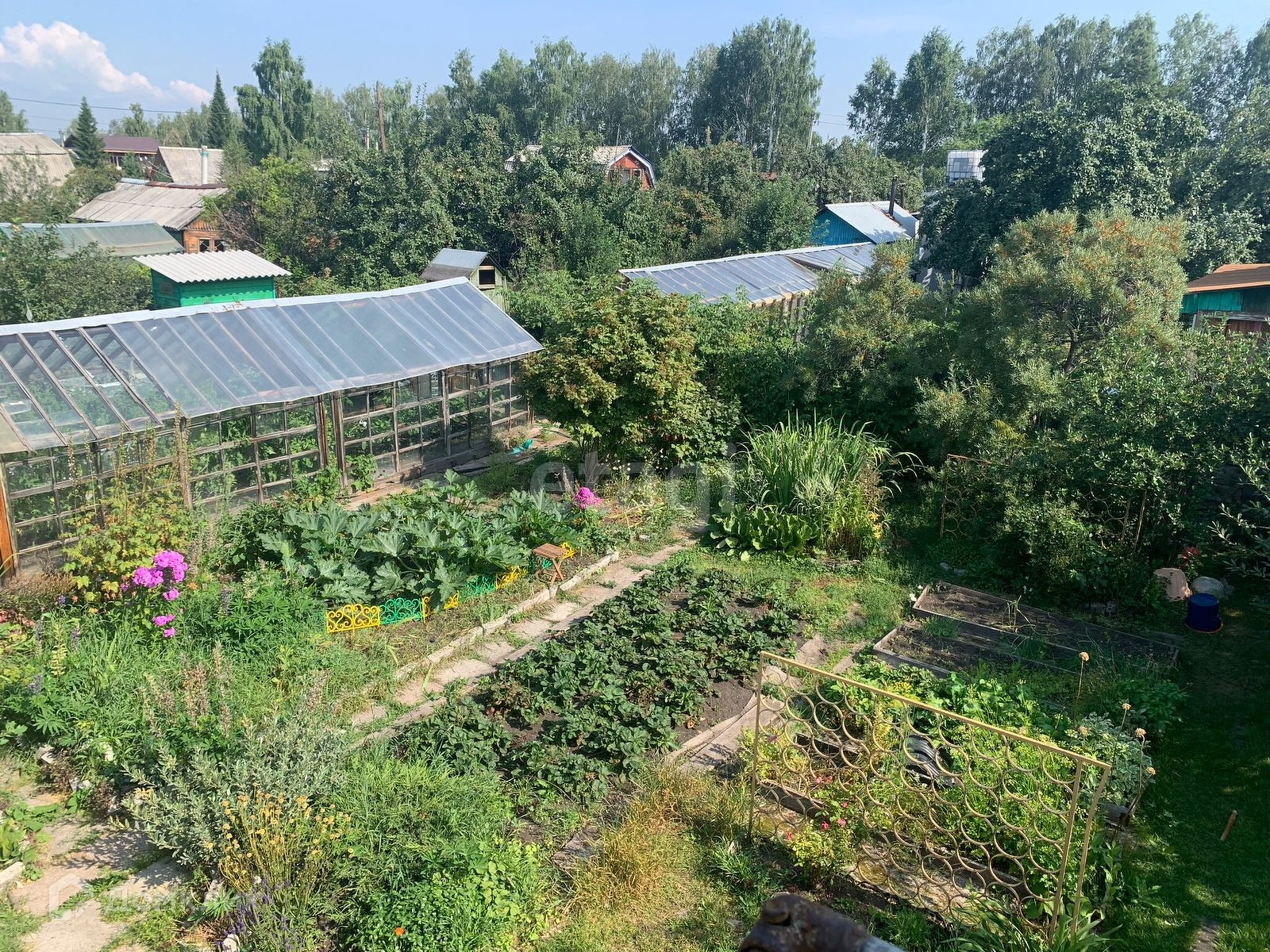 На участке дом, баня, теплица. Посажены плодовые деревья и кусты, есть место для отдыха.