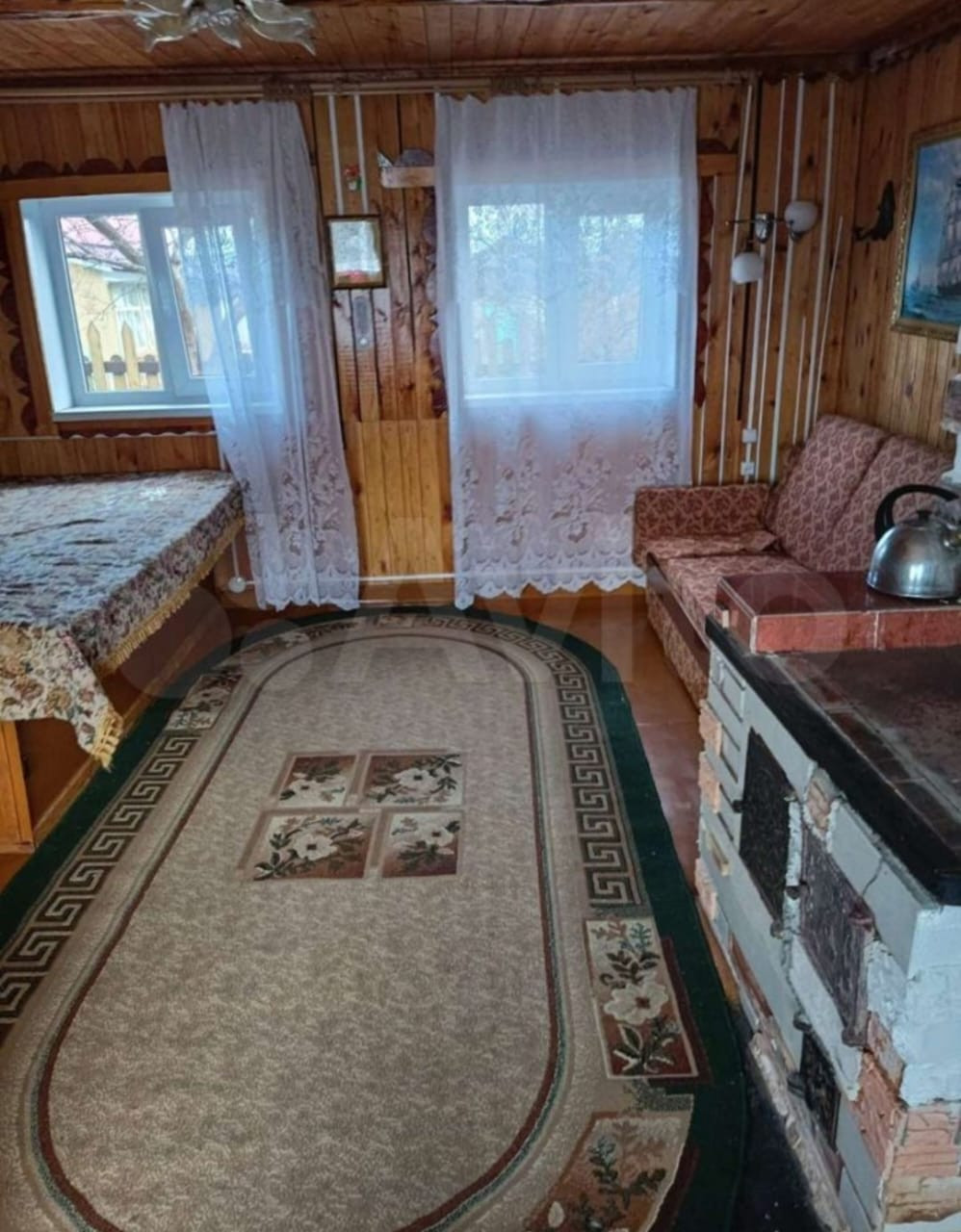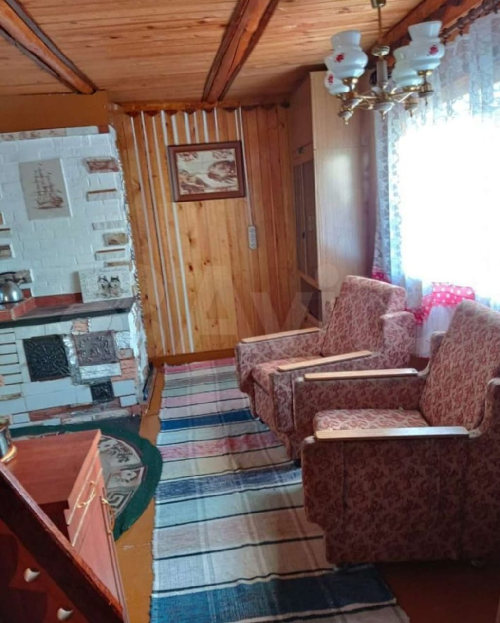 На участке шлакоблочный дом с летней мансардой и пристроем из бруса 43 кв м под общей крышей. В доме стеклопакеты, печное отопление (2 печи кирпичная и металлическая длительно горения), электричество.