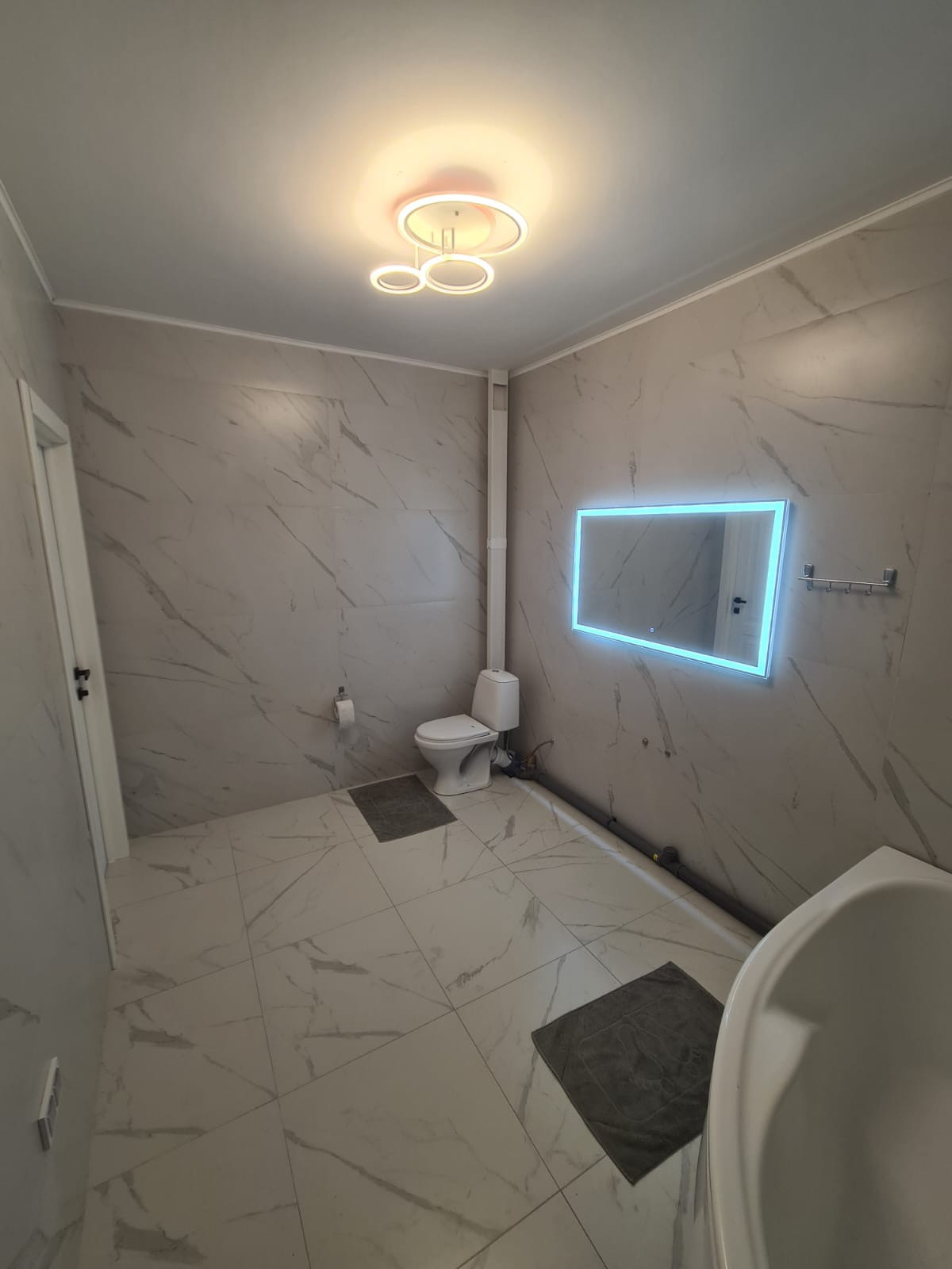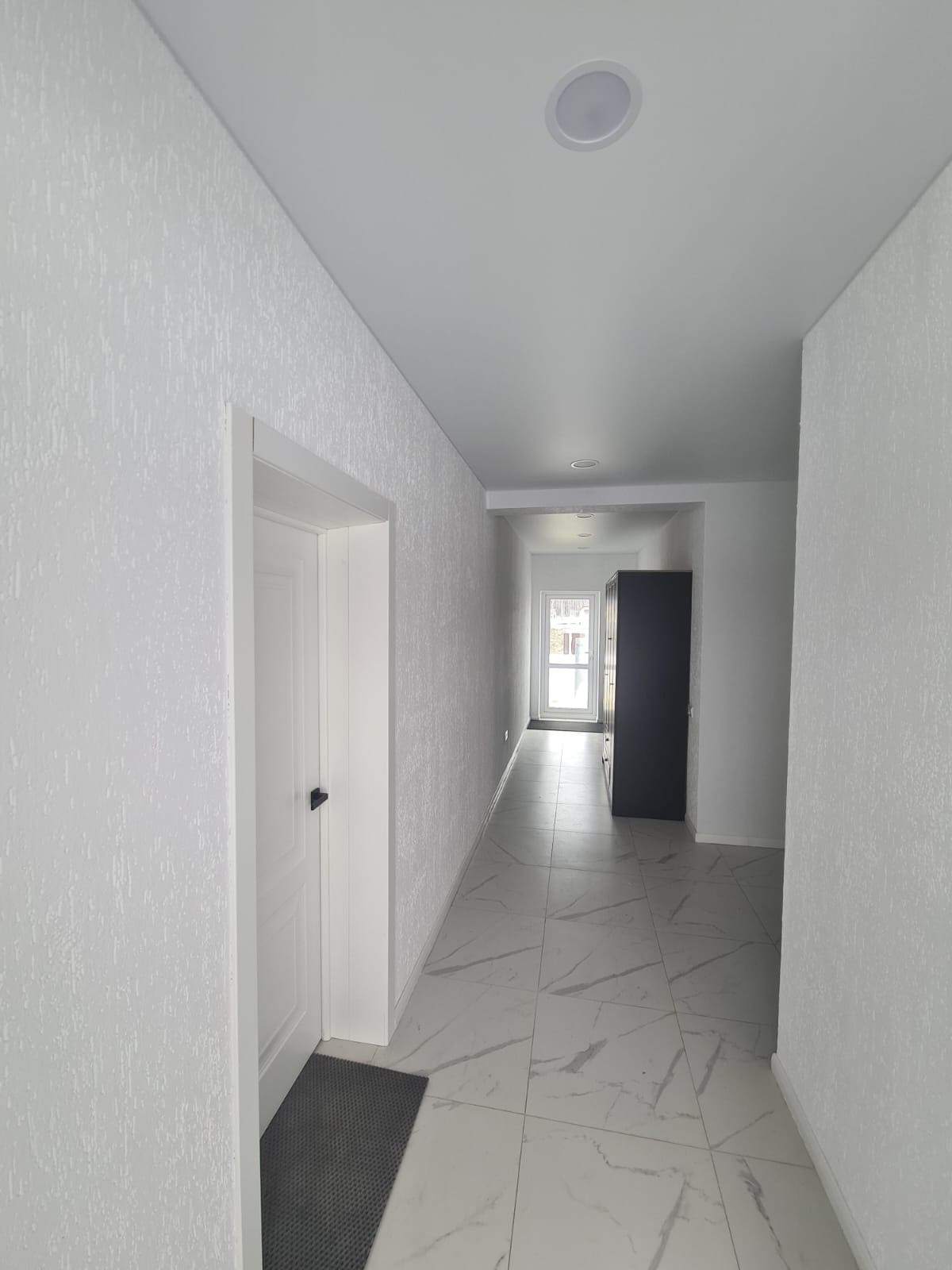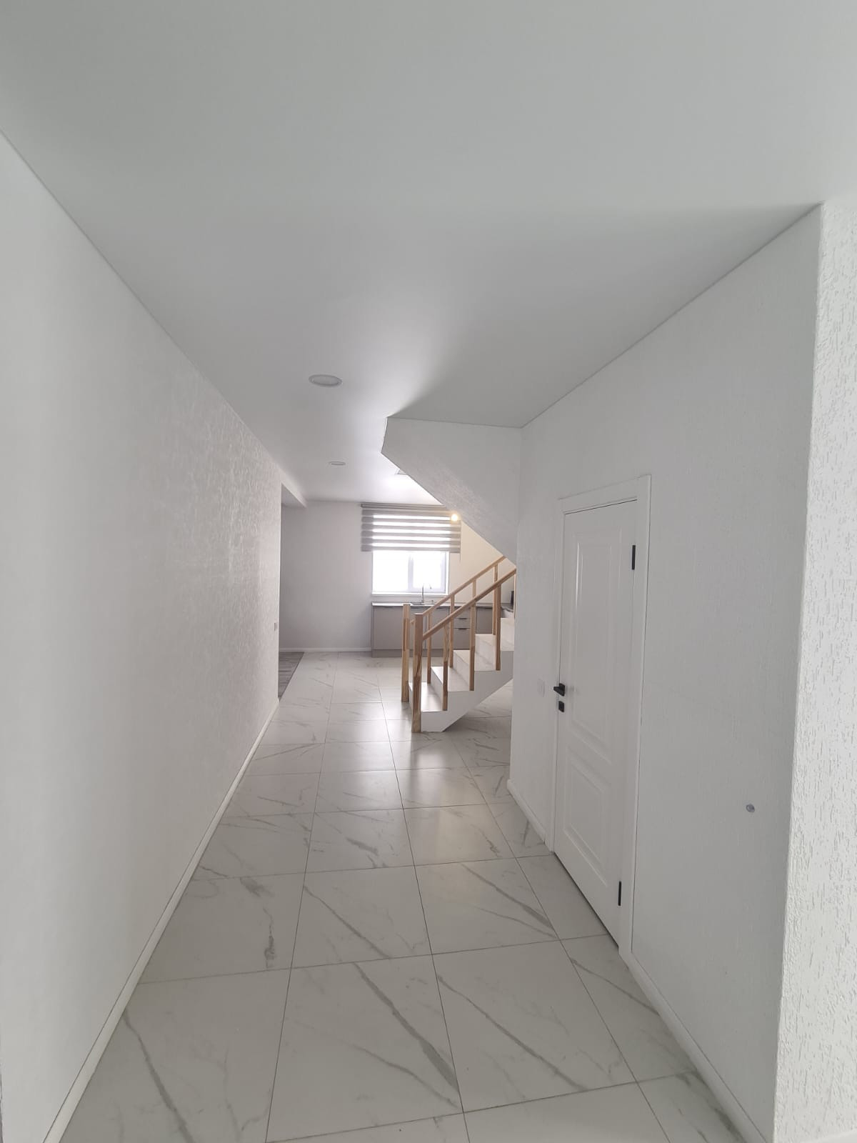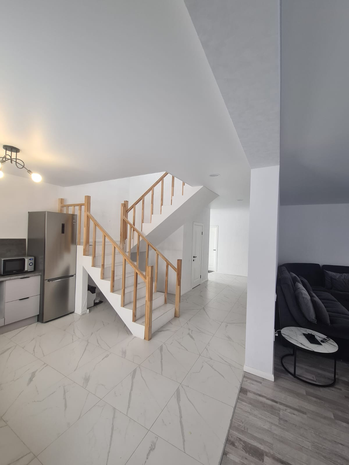 На первом этаже :холл, гостиная-кухня, санузел, терраса . Отдельный выход в гараж и на террасу . На полу в холле - качественный ламинат, на кухне и в коридорах керамогранит с тёплыми полами, санузел совмещенный в керамограните.