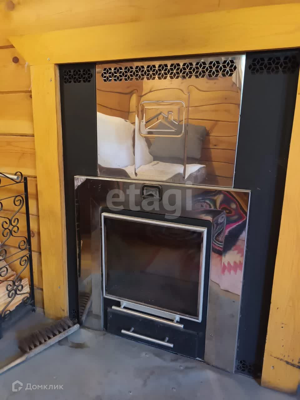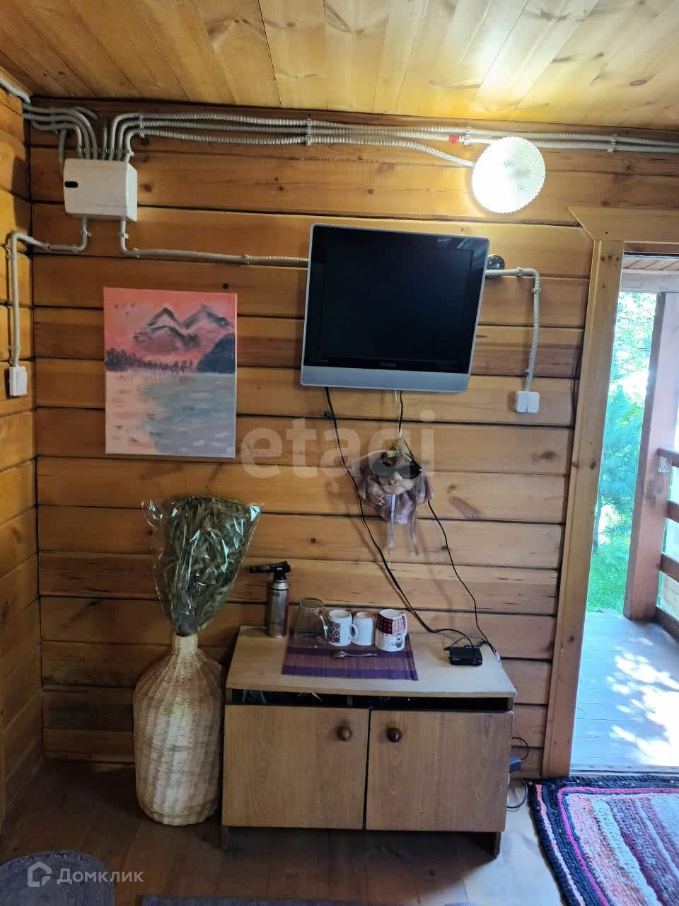 **На первом этаже дома расположена кухня и комната. На втором этаже два спальных места и места для хранения вещей. Есть выход на небольшой балкончик в сторону бани.