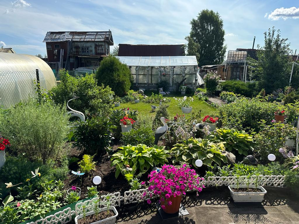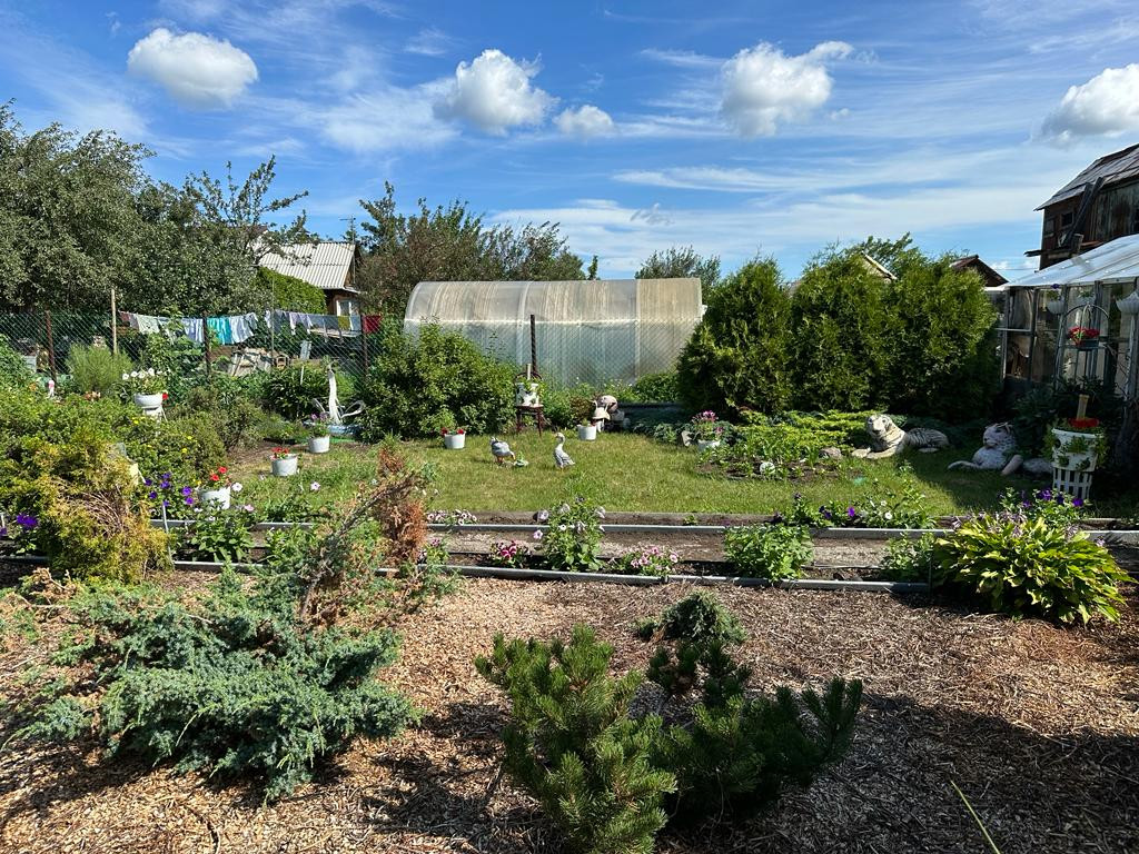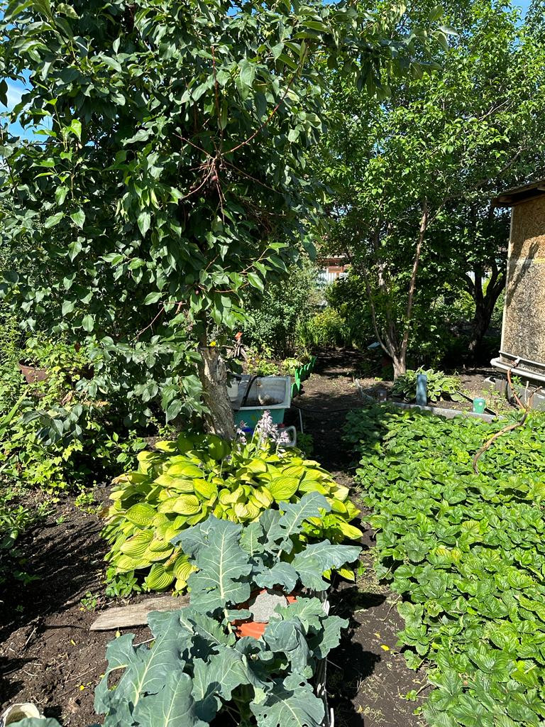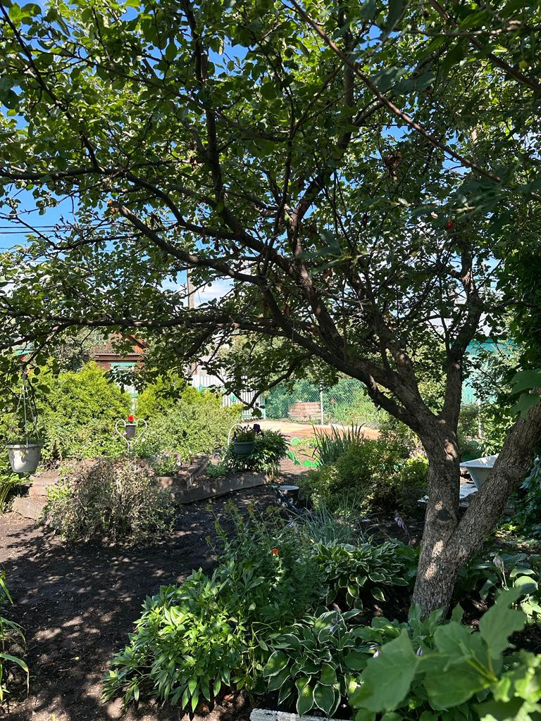 На участке много насаждений. Растет яблоня, а также плодово-ягодные кустарники: смородина, вишня, облепиха, малина, слива, крыжовник.