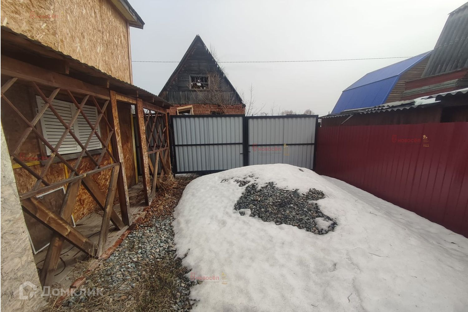 Участок окружен новым забором из металлопрофиля. На территории есть скважина с паспортом, двухэтажный садовый дом и навес-гараж. Участок ровный, растут елки и плодоносящие деревья. Здесь есть место для парковки еще двух автомобилей.