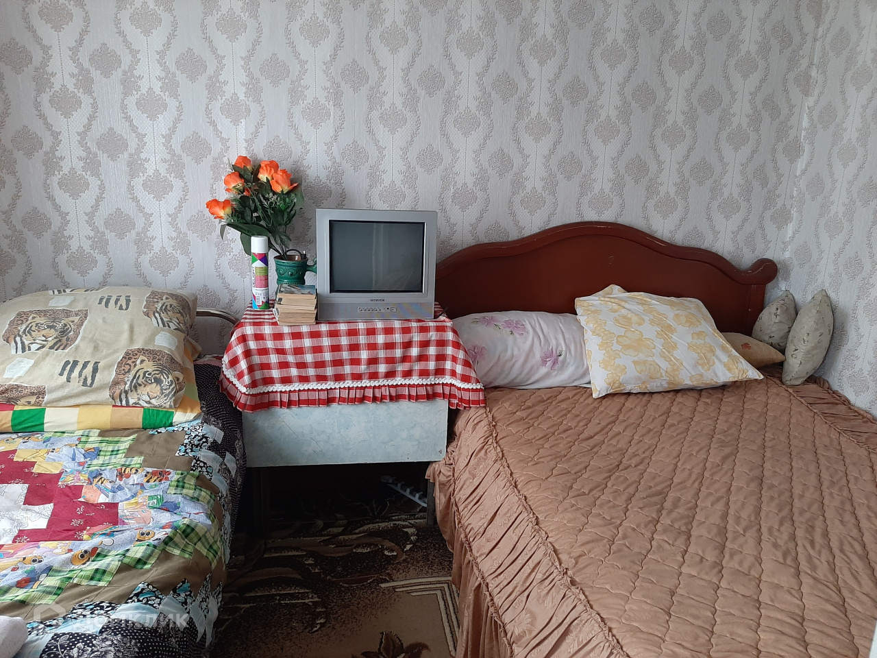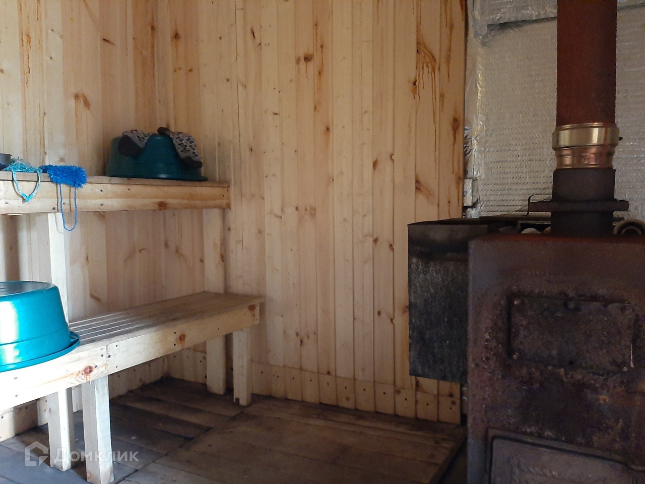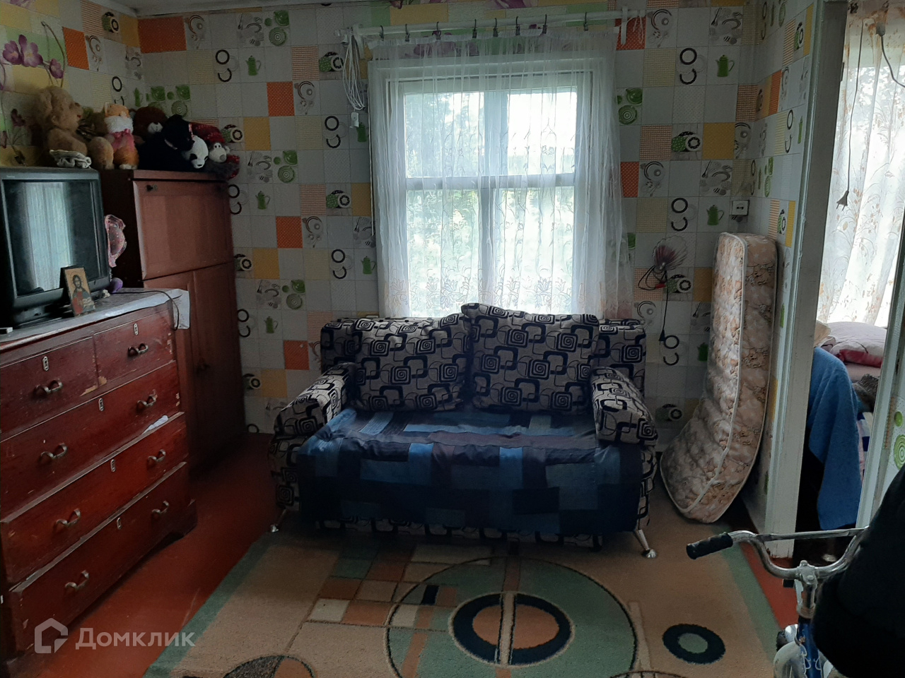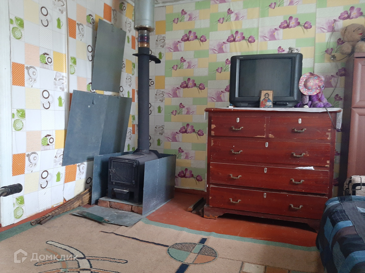 Дом обогревается железной печкой, окна деревянные, на стенах красивые обои.