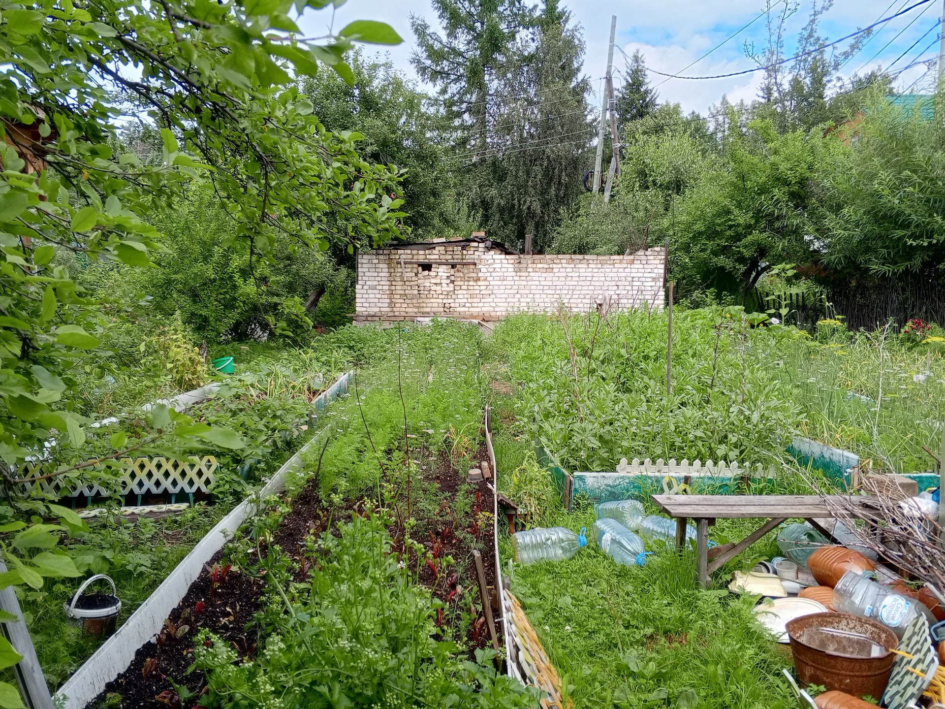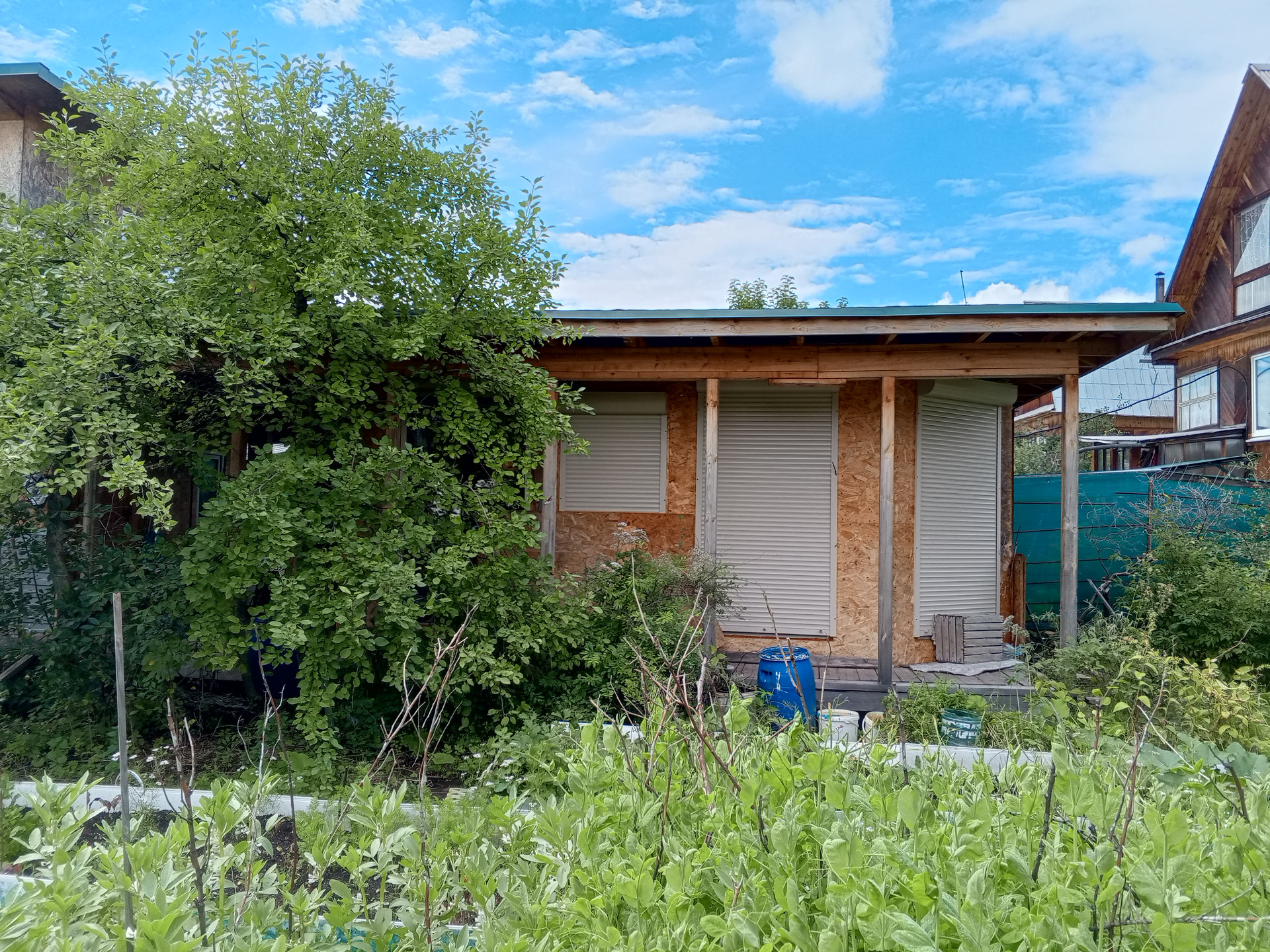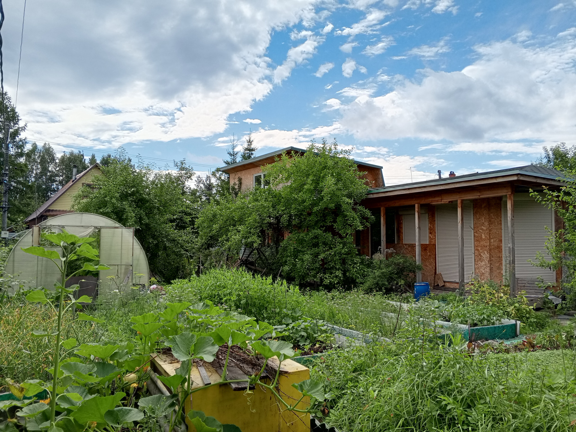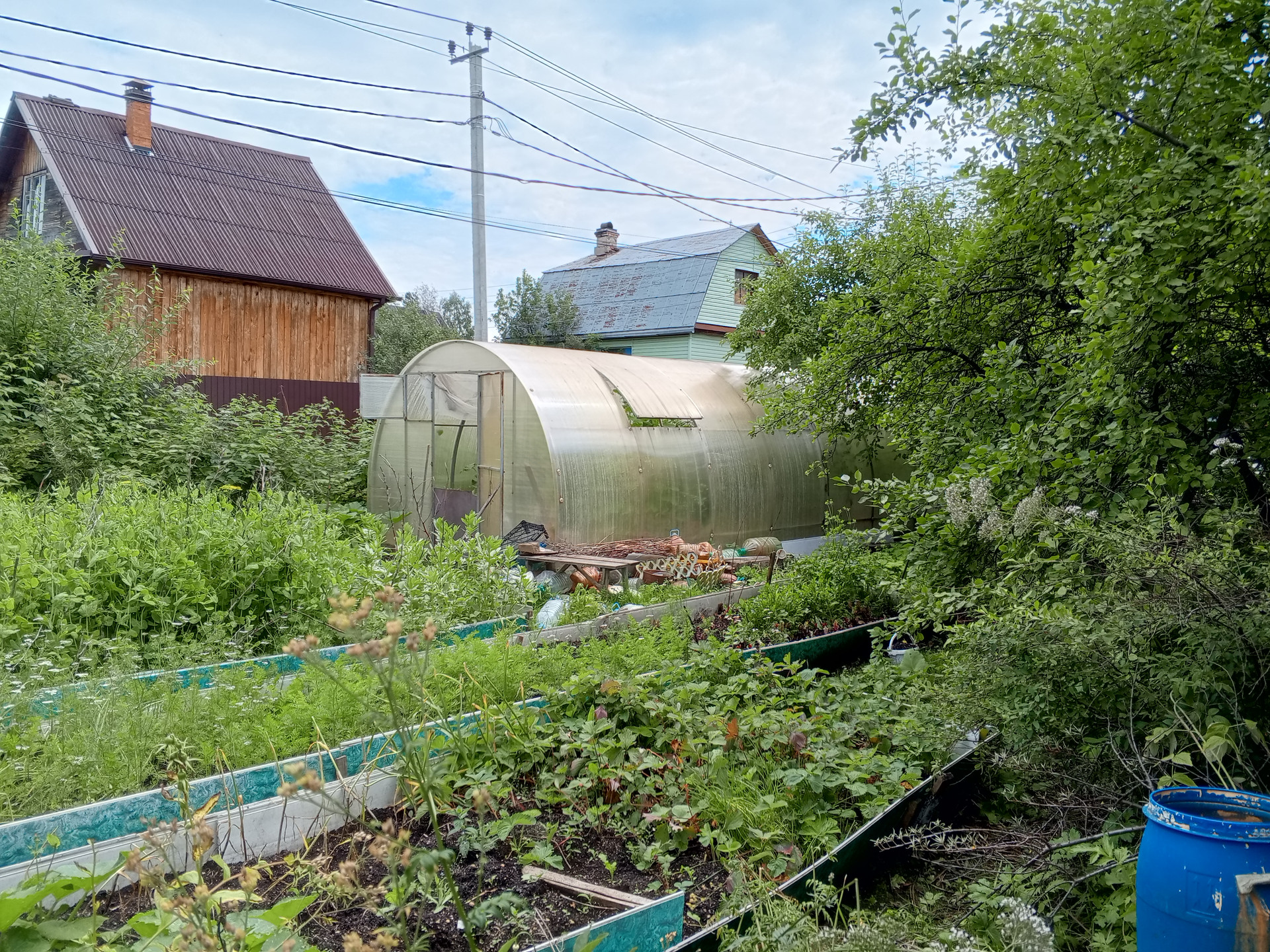 В саду: вместительная и прочная теплица, яблоня, крыжовник, смородина красная и черная, облепиха, малина, жимолость, слива, многолетние травы (чебрец, мелисса, мята, тархун, 8 сортов лука, можжевельник, чистотел, шалфей).