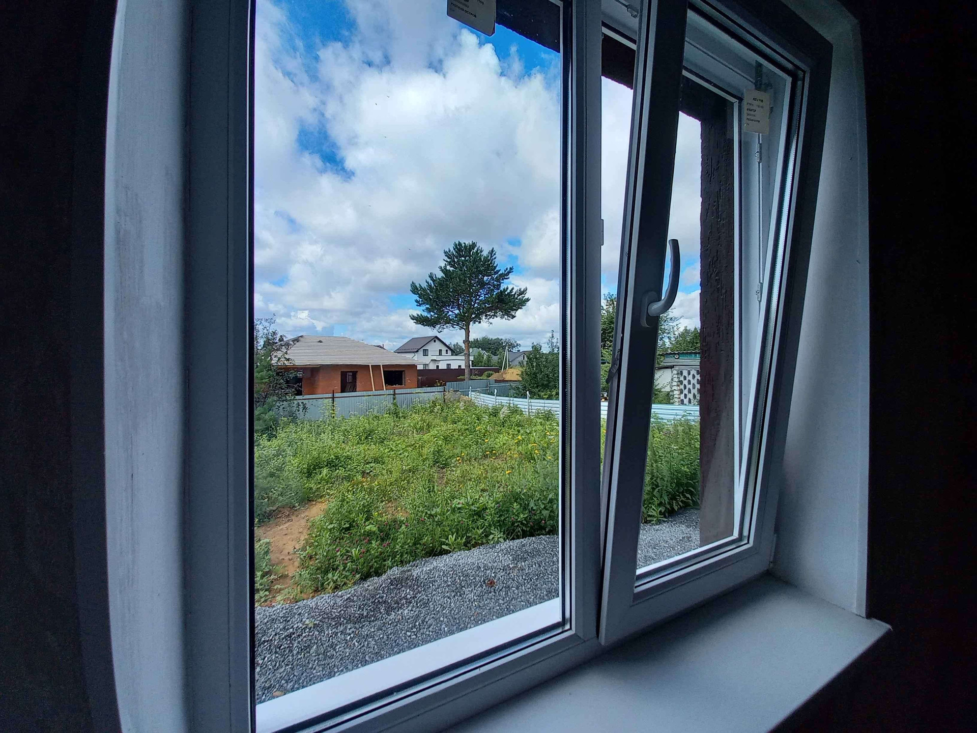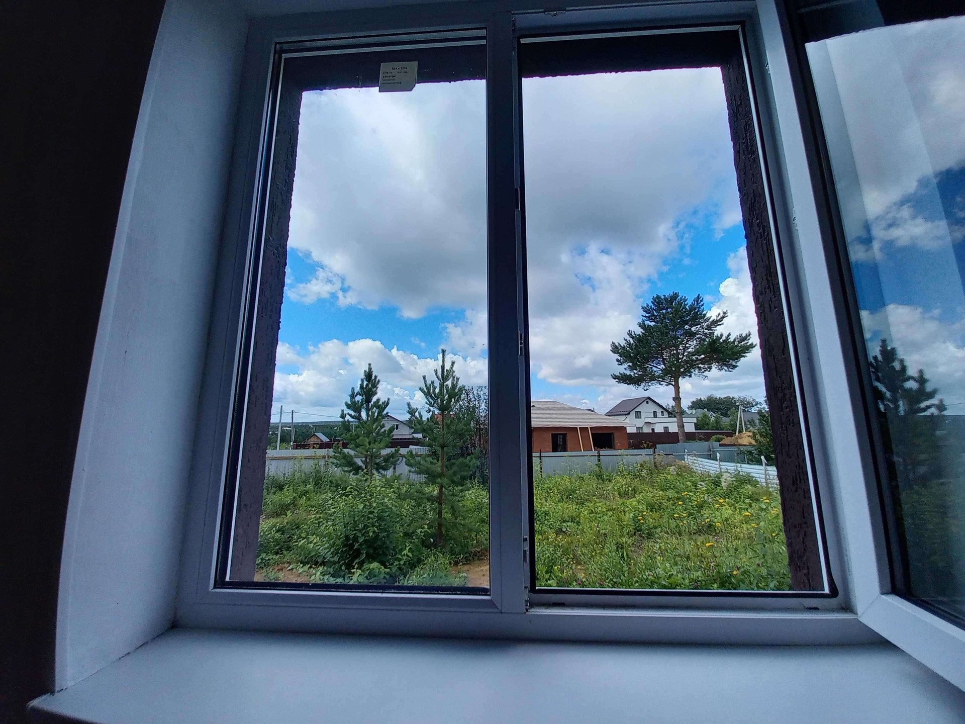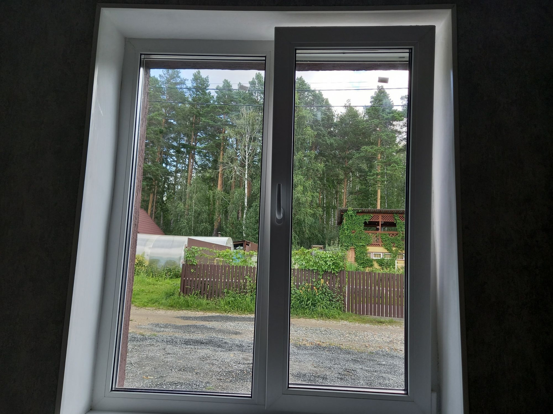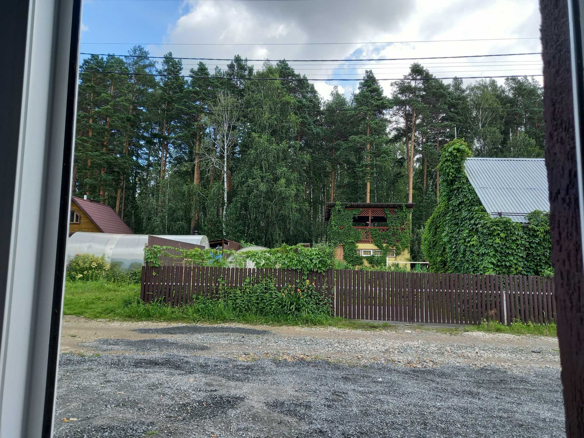 Дом в тишине, неподалёку от леса - птички поют, из окон виден лес. На участке - пушистые сосны и ёлочка во дворе.