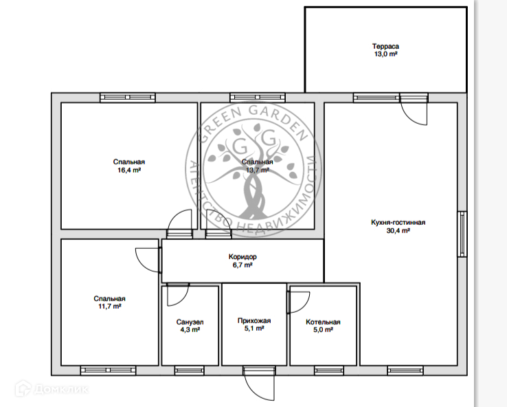 Кухня-гостиная 30.4 м2, три изолированные комнаты 14, 12 и 17м2, санузел 5м2.
