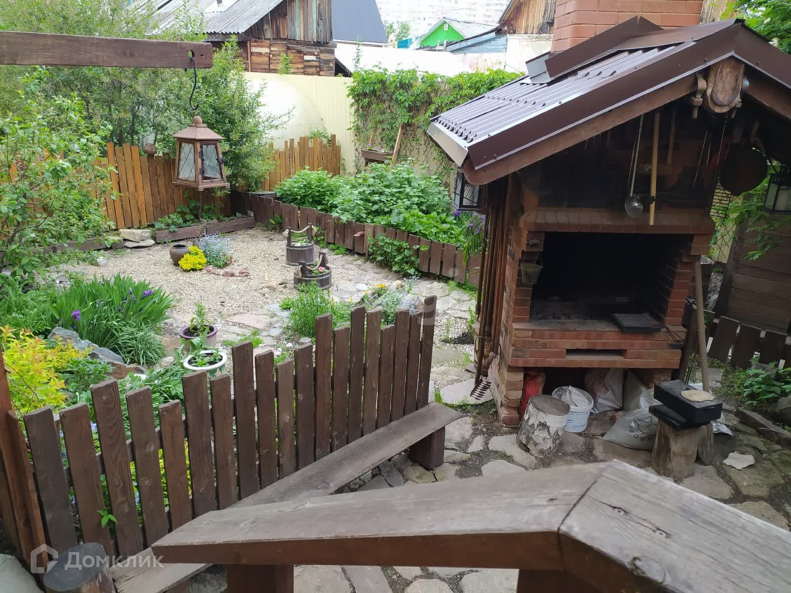 Из котельной выход на задний двор. Зона барбекю, декоративные и плодовые растения.