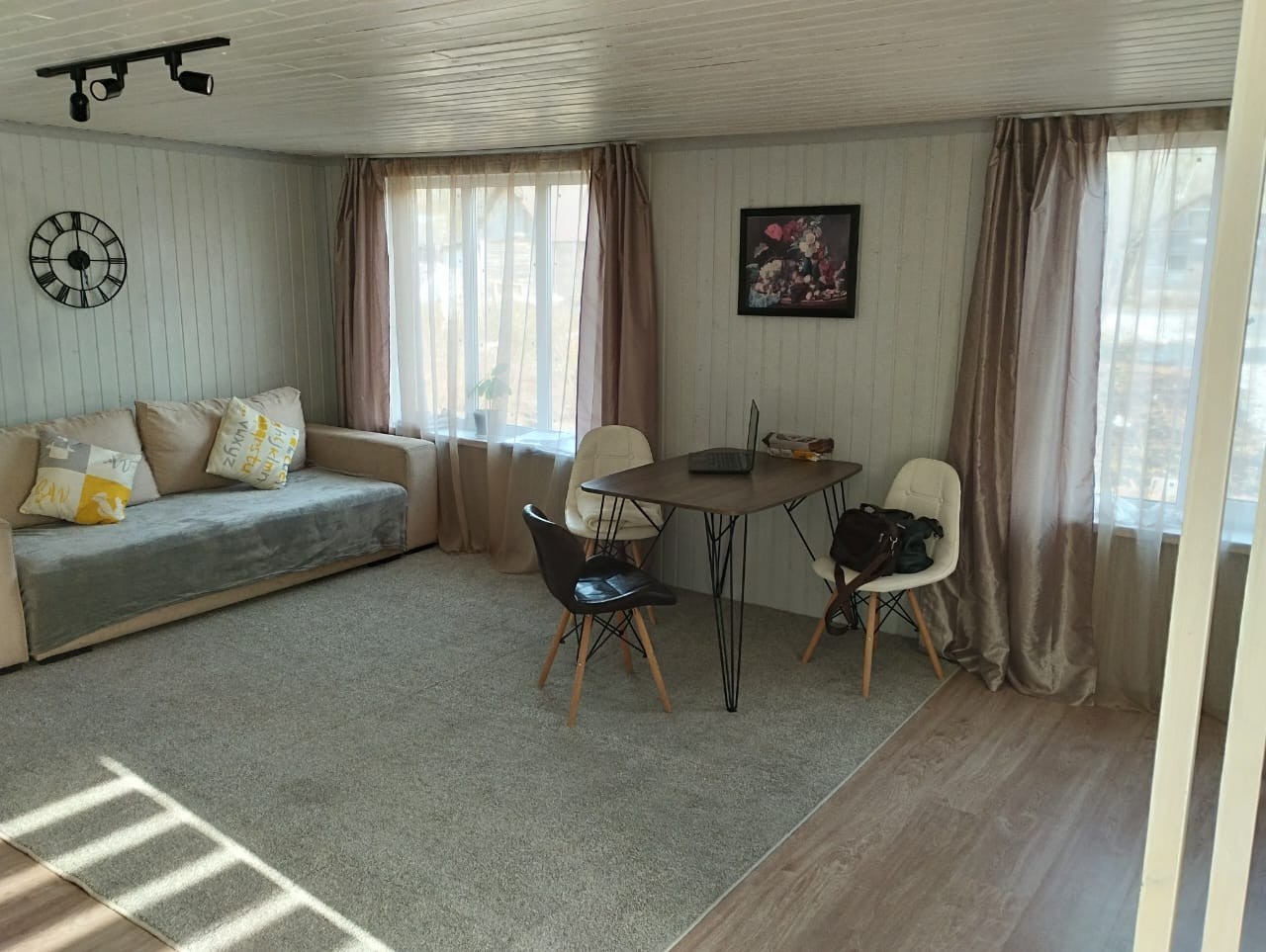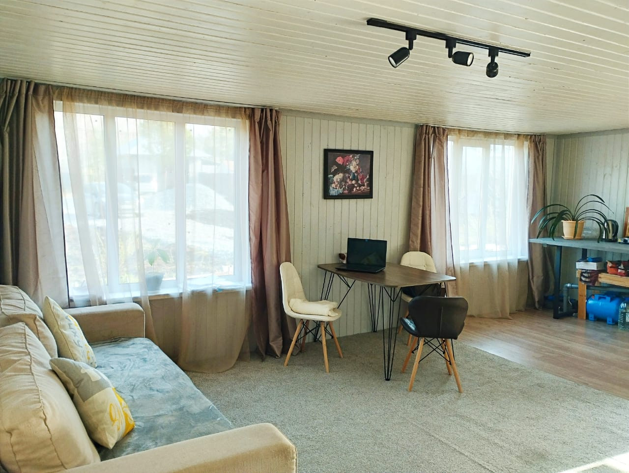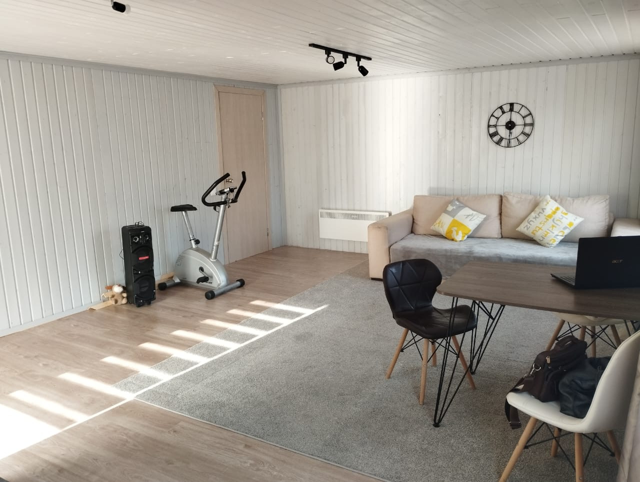 Дом площадью 43.3 кв.м. готов к комфортному проживанию: две комнаты (кухня-гостиная 29 кв.м и спальня 9 кв.м), ванная комната 6 кв.м. Все необходимые коммуникации подведены: электричество 380В, своя скважина и септик.