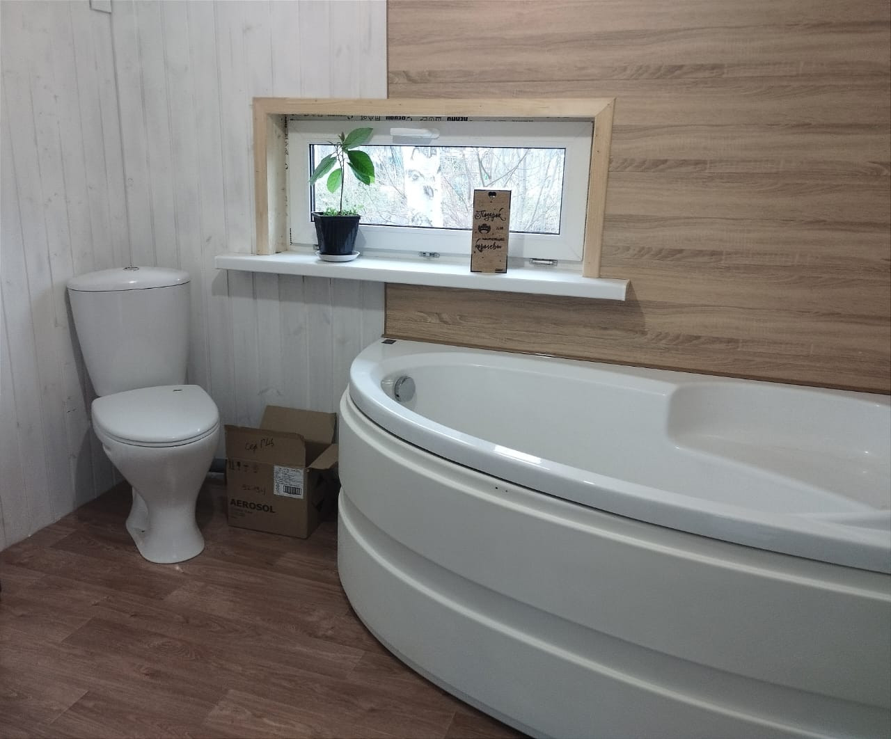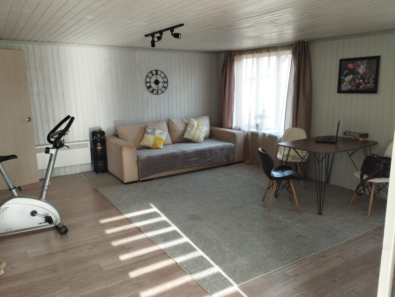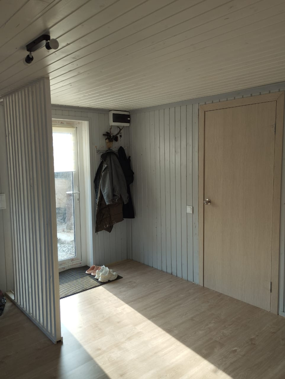 Дом площадью 43.3 кв.м. готов к комфортному проживанию: две комнаты (кухня-гостиная 29 кв.м и спальня 9 кв.м), ванная комната 6 кв.м. Все необходимые коммуникации подведены: электричество 380В, своя скважина и септик.