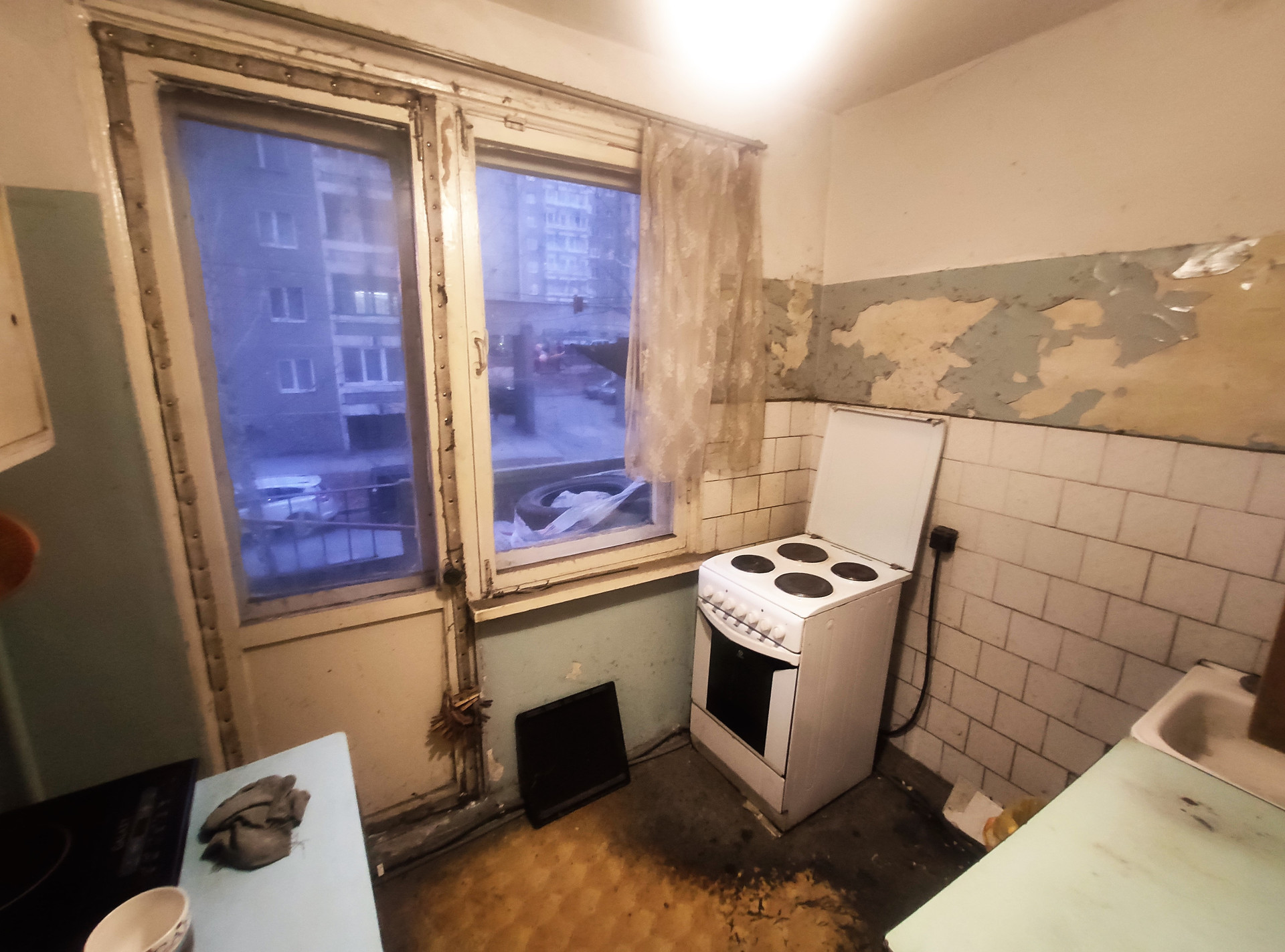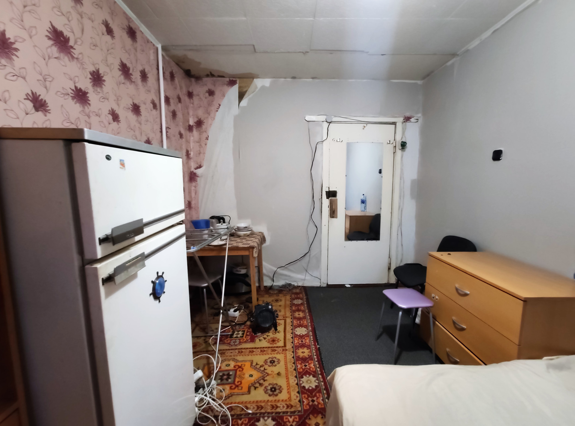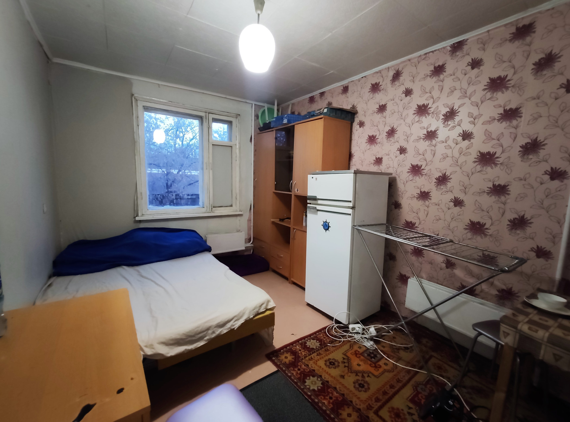 Комната находится на 2 этаже панельного дома. Окно комнаты выходит во двор. Из мебели в комнате остается все, что на фото, холодильник и стиральная машина рабочие в хорошем состоянии.